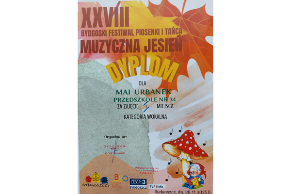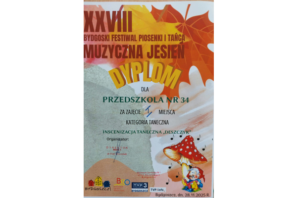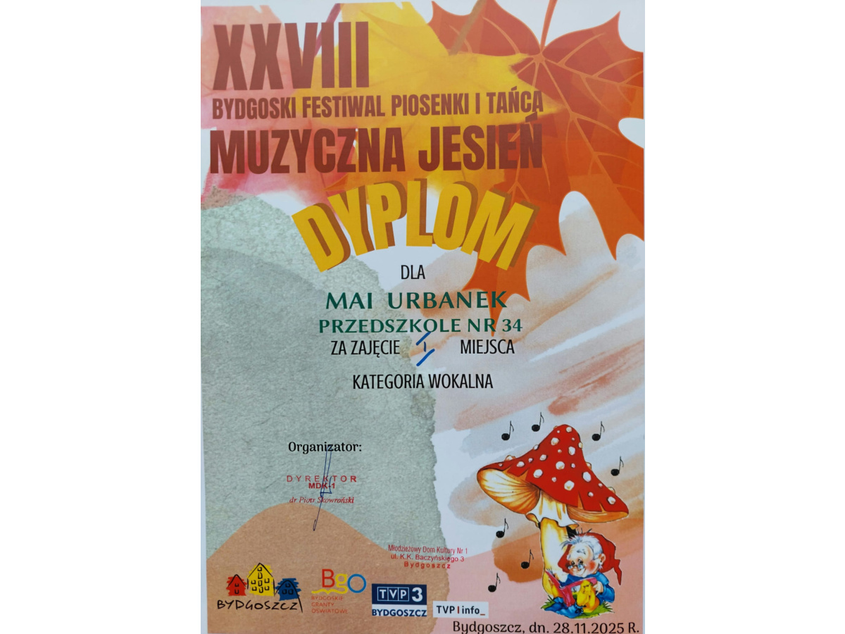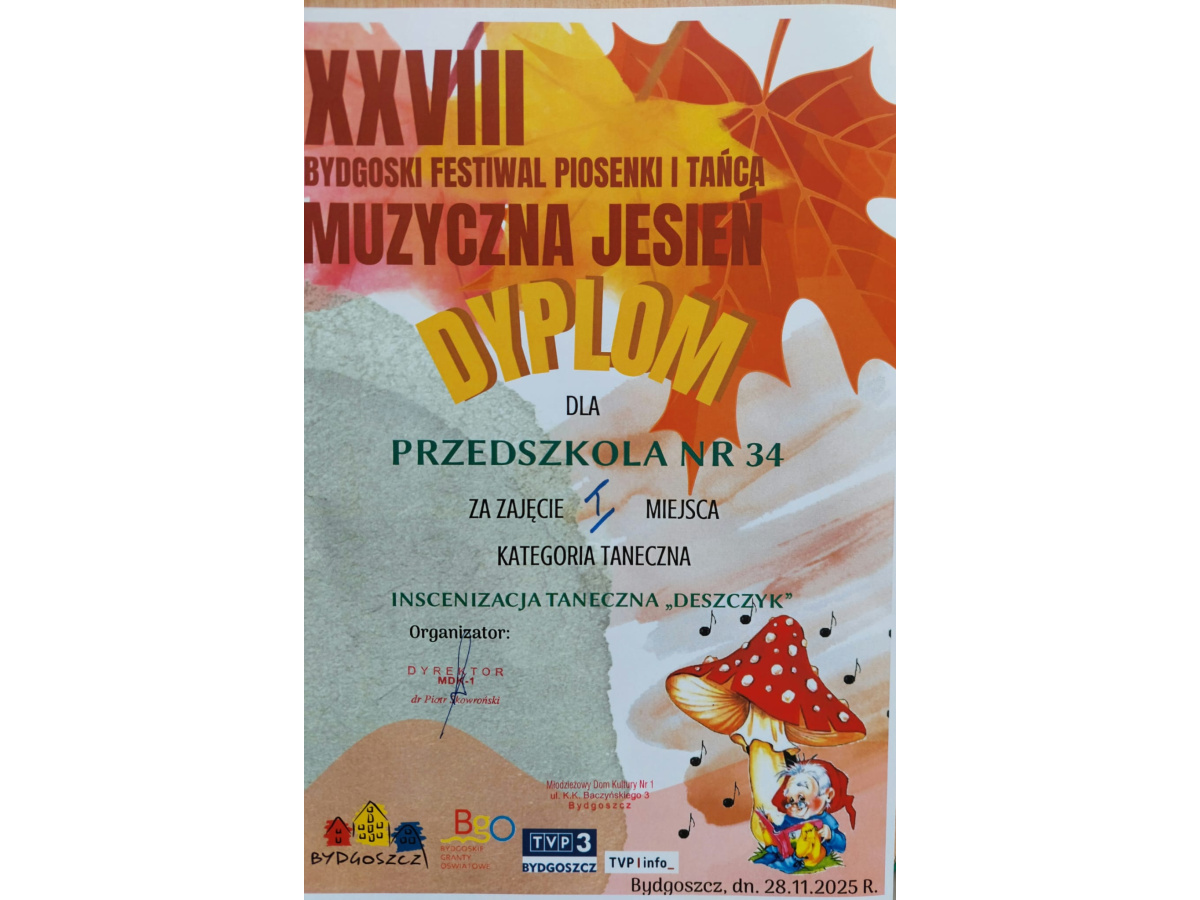 Dnia 28.11.2025 odbył się finał Bydgoskiego Festiwalu Piosenki i Tańca XXVIII Muzycznej Jesieni organizowany przez MDK 1 w Bydgoszczy. Dzici z grupy Wiewiórek odnisły duży sukces.