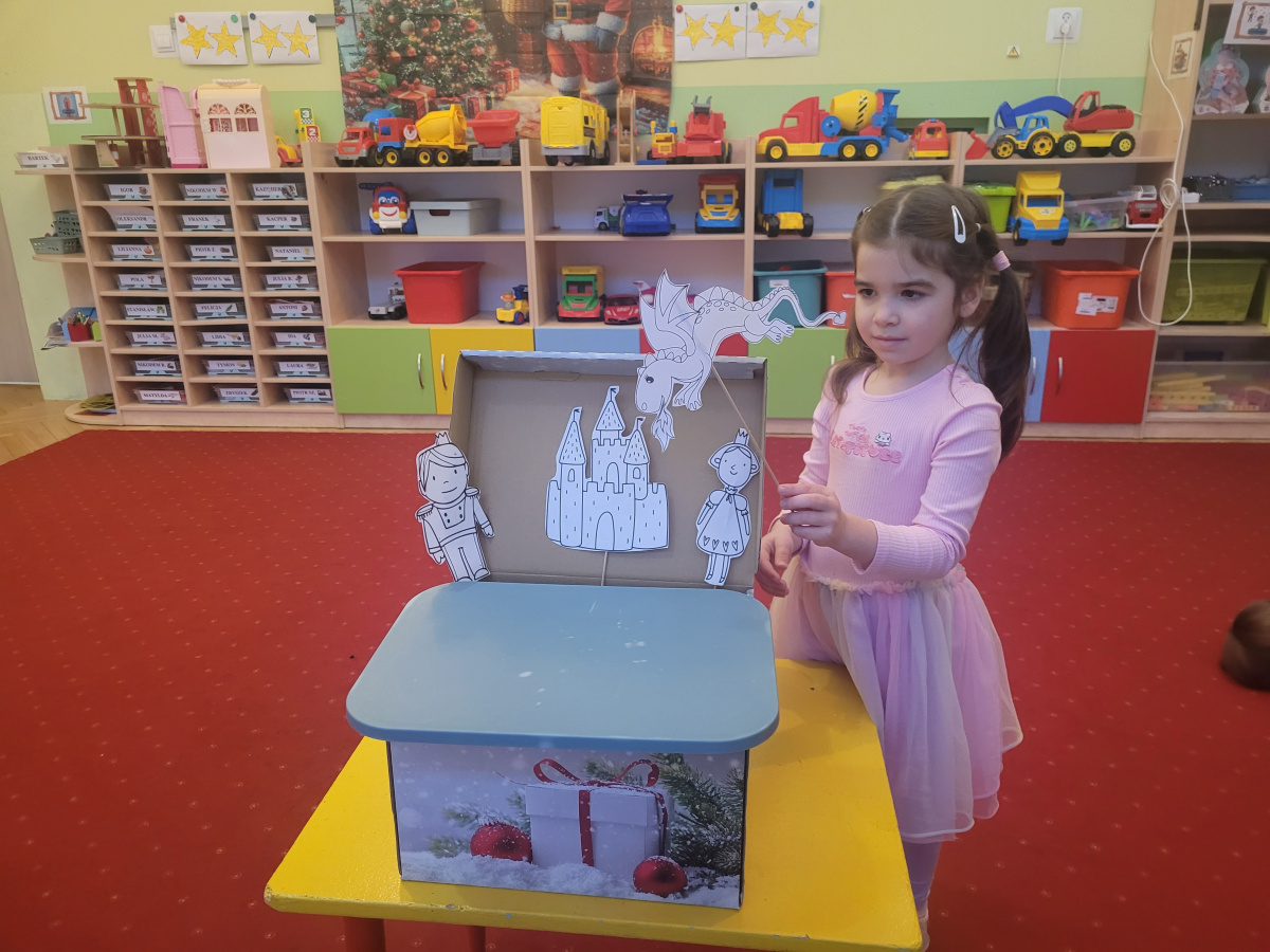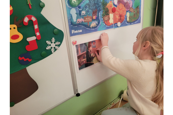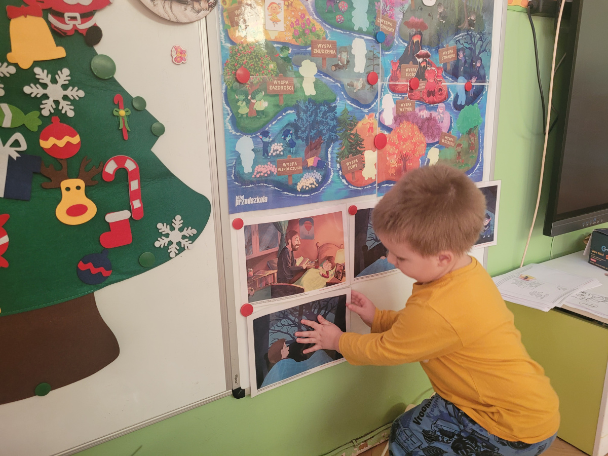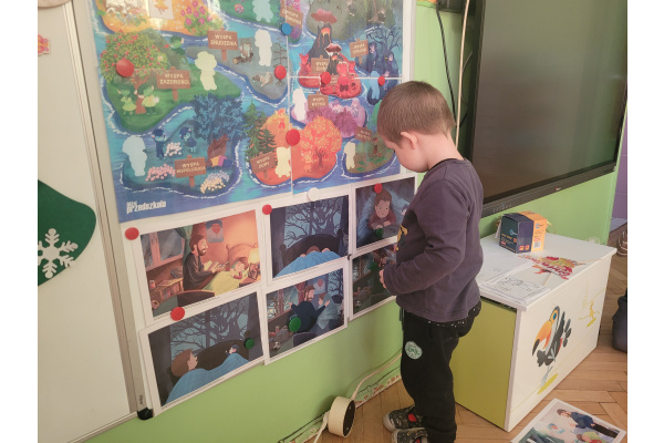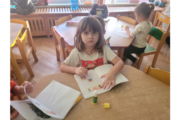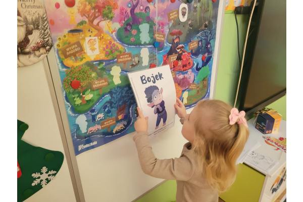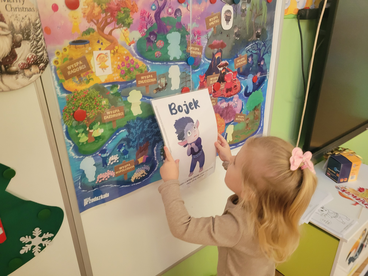 Podczas kolejnych zajęć z cyklu "Czuciaki z Krainy Emocji ", dzieci spotkały się z Bojkiem- postacią uosabiającą strach. W trakcie wspólnej zabawy przedszkolaki uczyły się, że bać się to nic złego. Dzieci uzupełniły także książeczki, wklejając postać Bojka i wyrażając za pomocą rysunku, co budzi w nich strach.