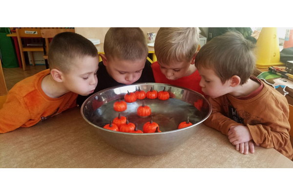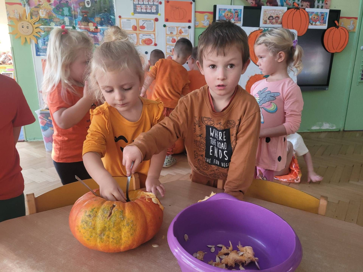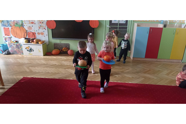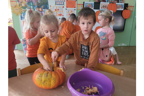 Dzień Dyni w naszym przedszkolu to był pełen edukacji i zabaw, podczas którego dzieci poznawały dynię pod różnymi względami y dzień: poznawczym, artystycznym, ruchowym i kulinarnym.