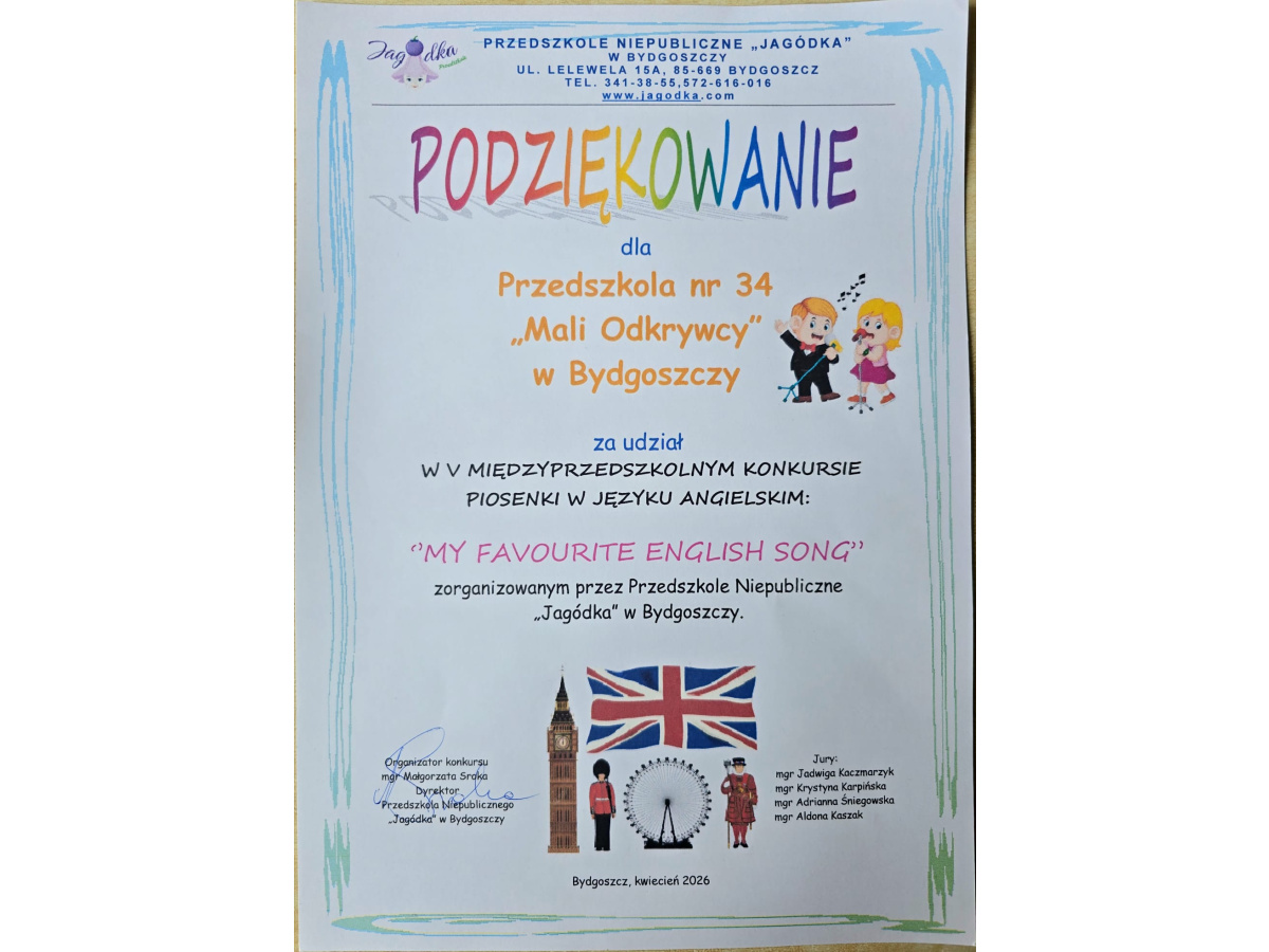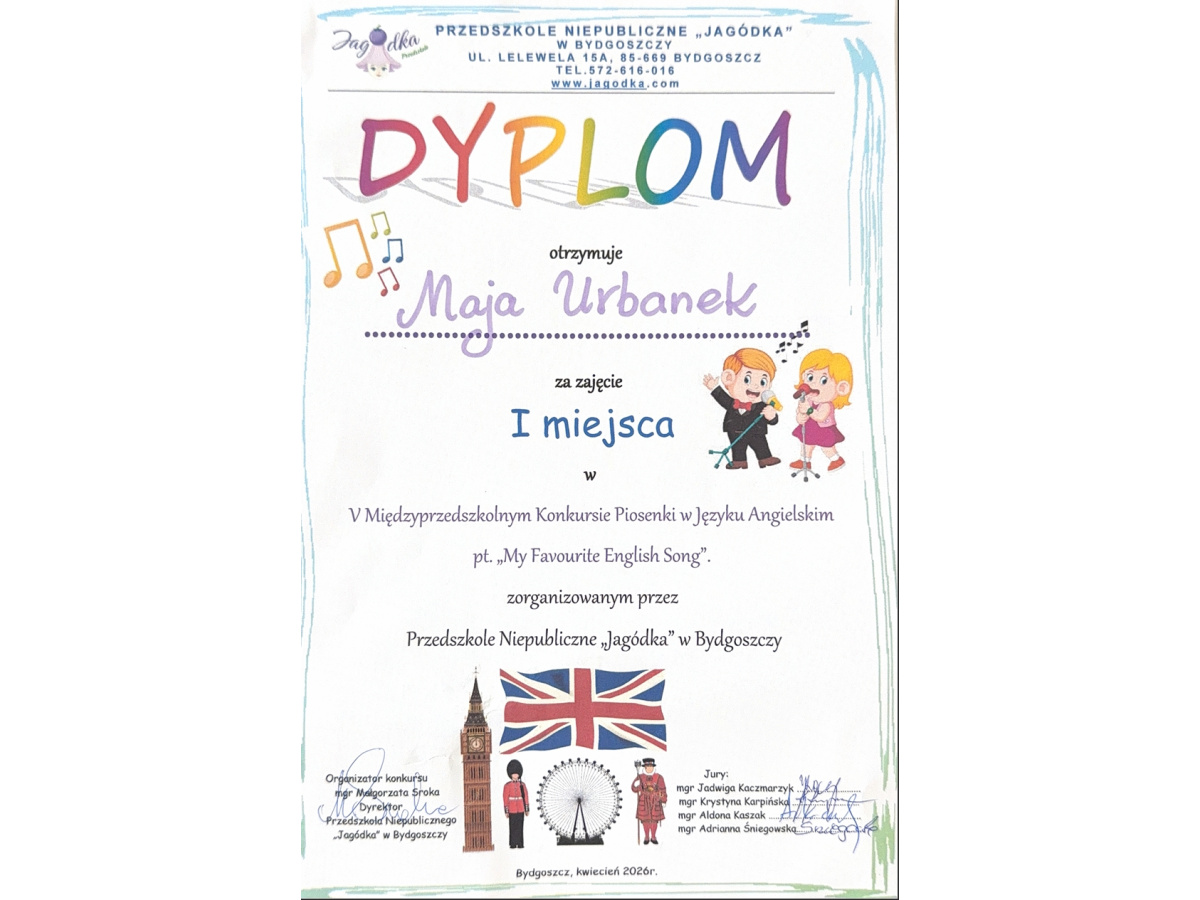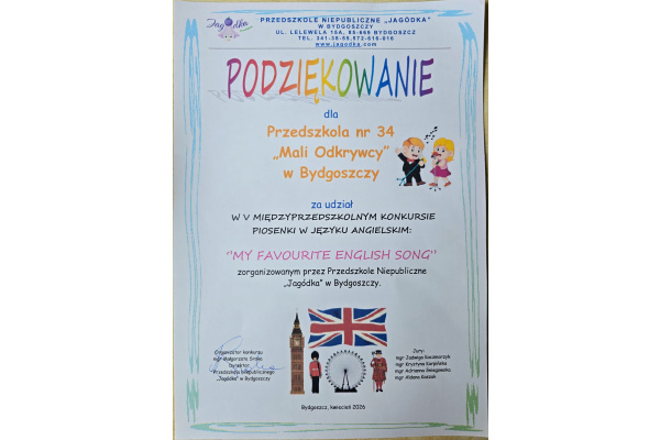 15 kwietnia w Niepublicznym Przedszkolu "Jagódka" odbył się kolejny raz międzyprzedszkolny konkurs piosenki angielskiej "My Favourite English Song".