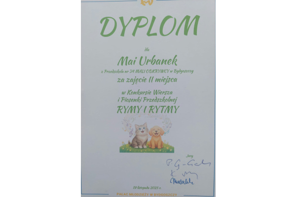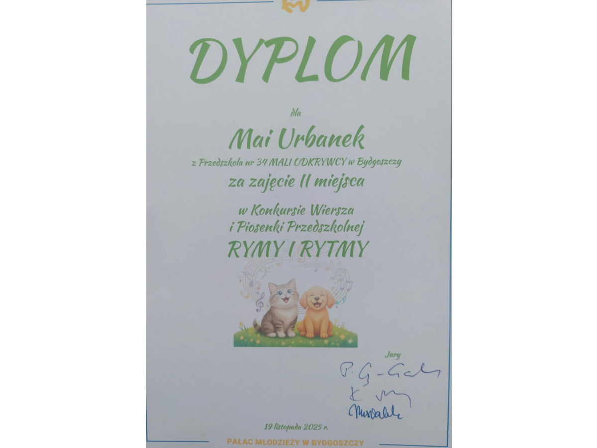 Maja z grupy Wiewiórek wzięła udział w Konkursie Wiersza i Piosenki Przedszkolnej i zajęła w nim II miejsce.
