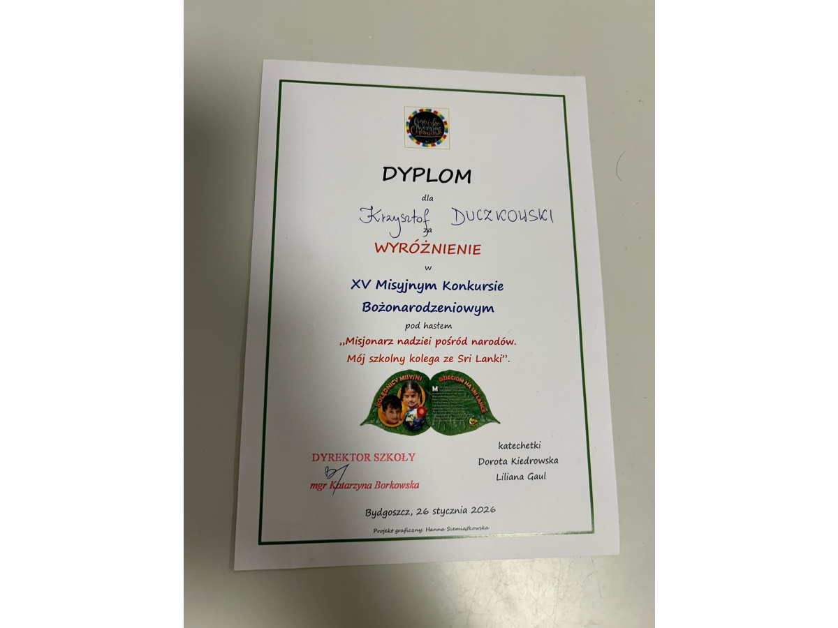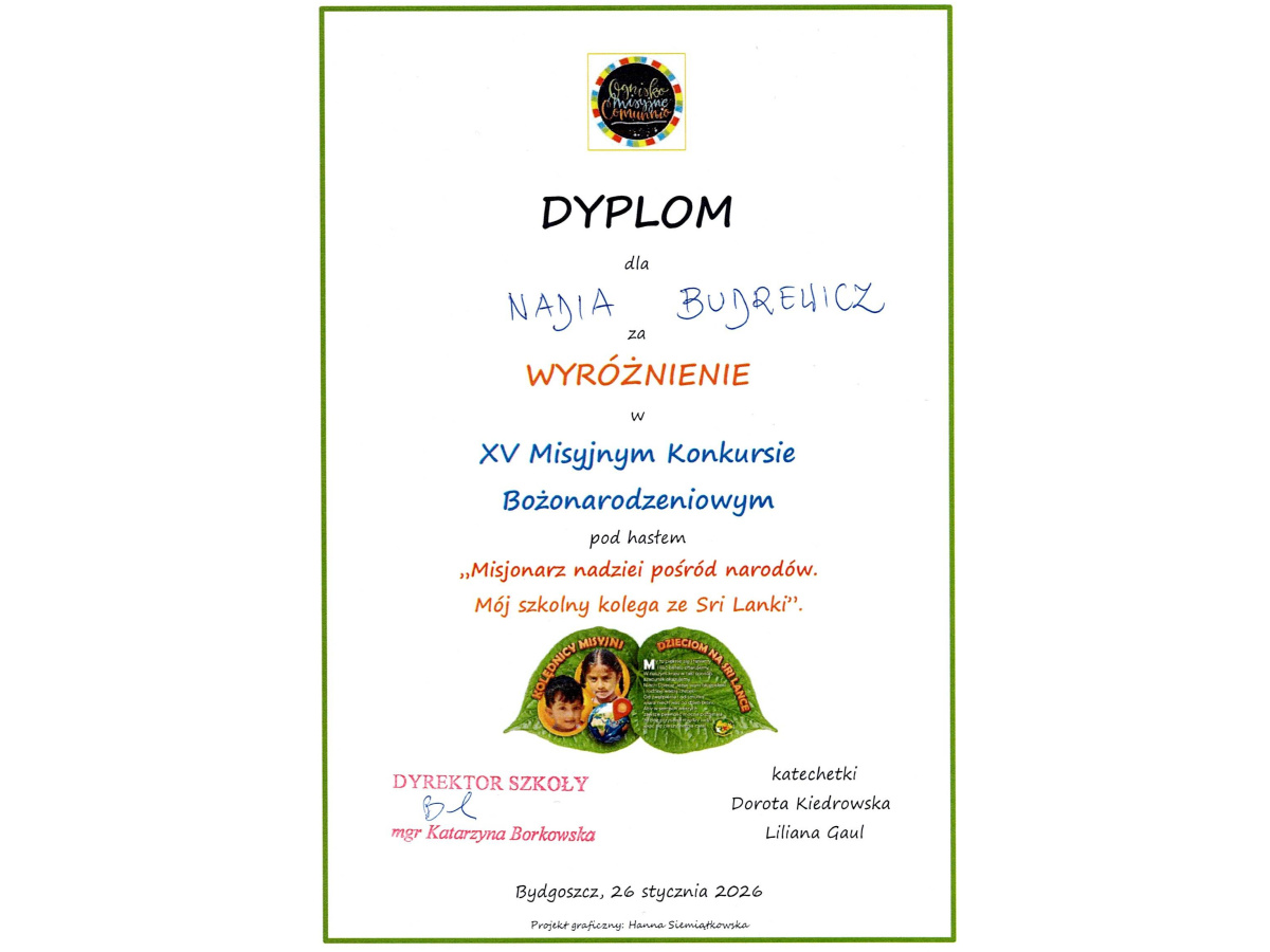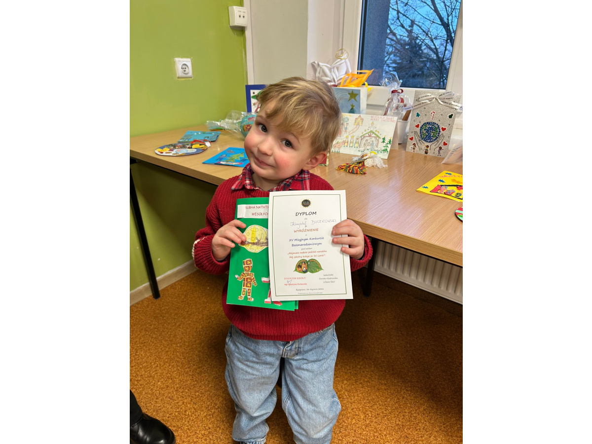 XV Misyjny Konkurs Bożonarodzeniowy pod hasłem "Misjonarz nadziei pośród narodów - mój szkolny kolega ze Sri Lanki" za nami. Konkurs organizowany jest co roku przez Szkołę Podstawową nr 12 w Bydgoszczy. Jest nam niezmiernie miło poinformować, że w tegorocznej edycji naszych dwóch przedszkolaków zdobyło Wyróżnienia. Jest to ogromny sukces, ponieważ konkurs ten jest organizowany również dla dzieci szkolnych. W prac w tym roku wpłynęło bardzo dużo - około 100.