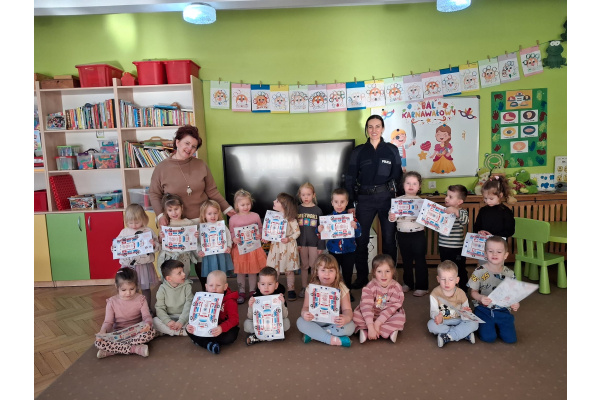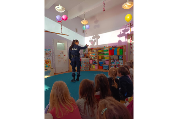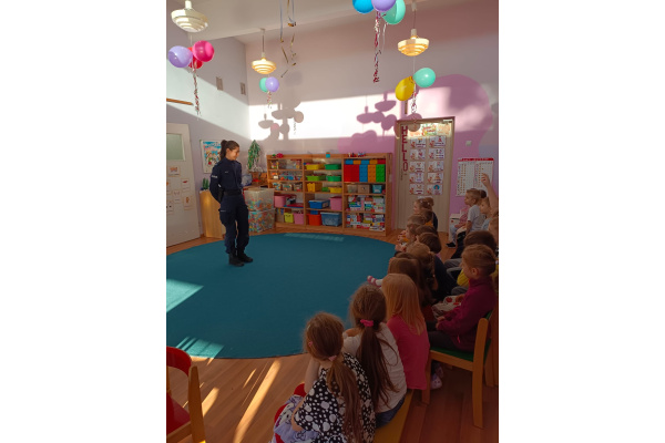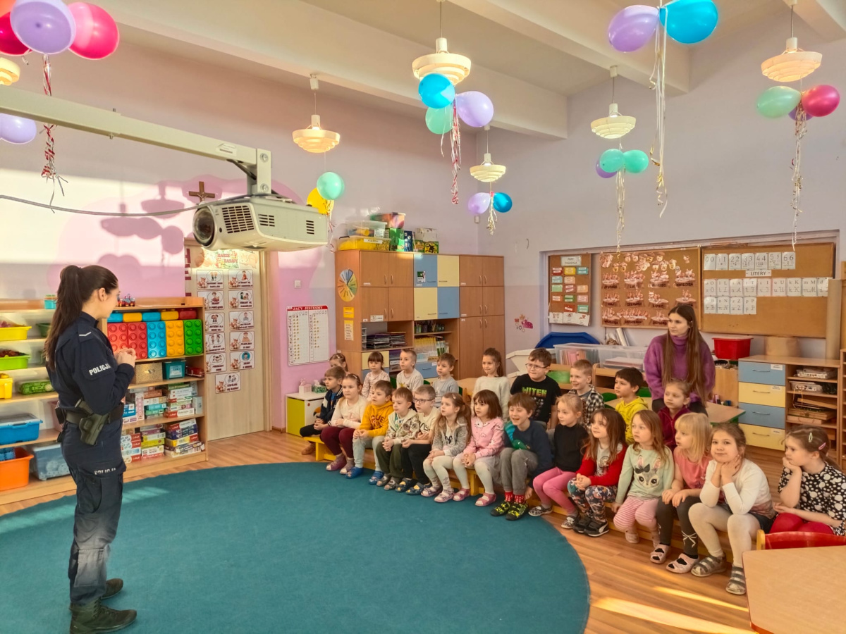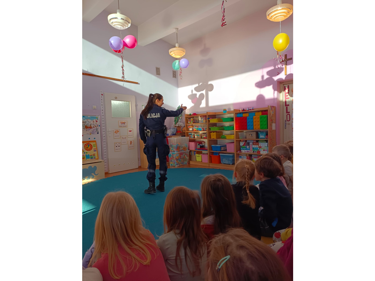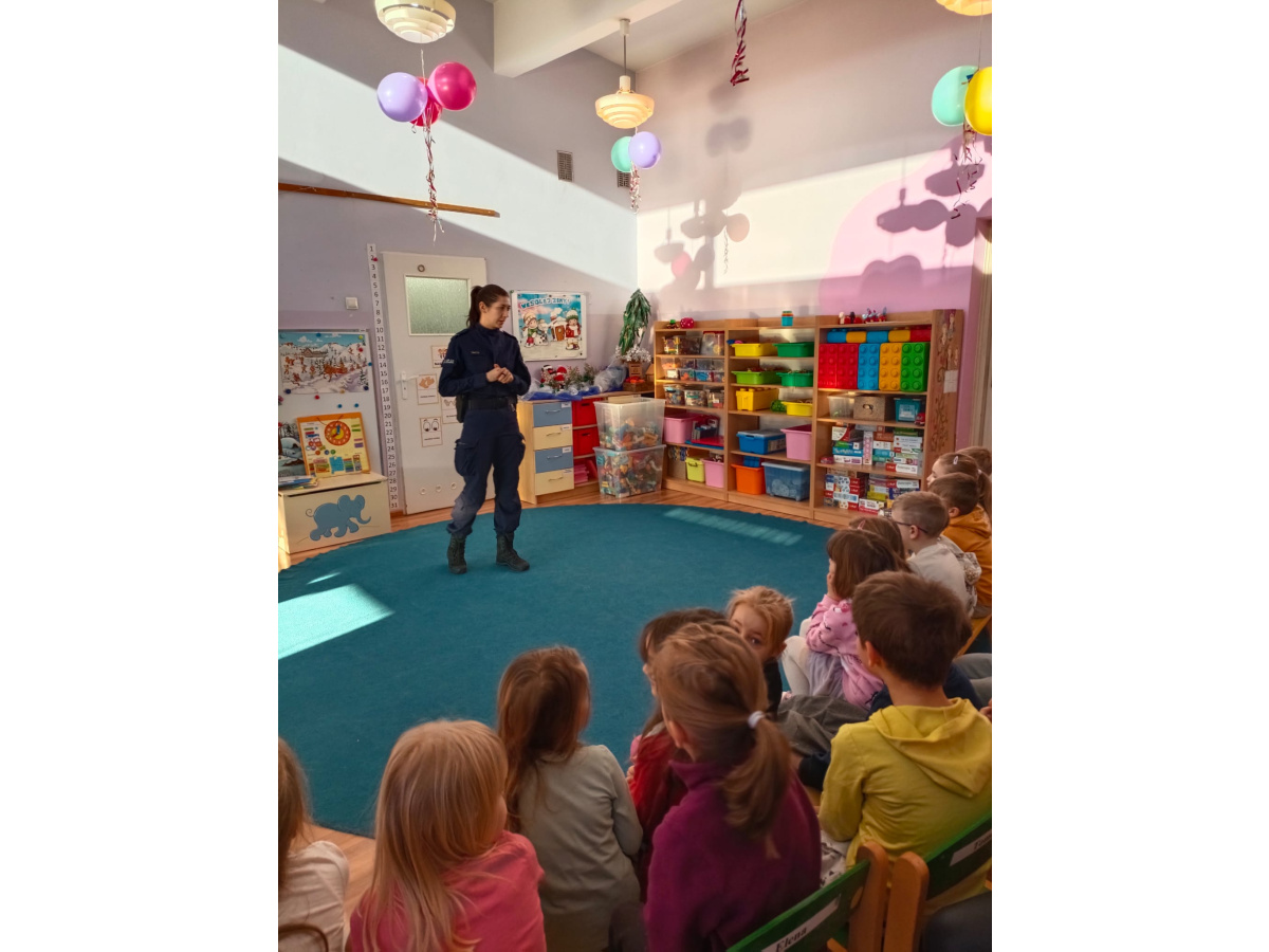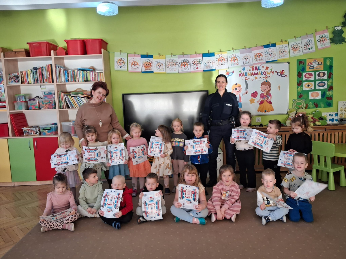 W naszym przedszkolu odbyła się wizyta pań policjantek z Komisariatu Bydgoszcz Błonie. Funkcjonariuszki przypomniały dzieciom najważniejsze zasady bezpieczeństwa podczas ferii zimowych, a także omówiły prawidłowe zachowanie na ulicy, w tym bezpieczne przechodzenie przez pasy. Przedszkolaki wysłuchały również pogadanki na temat unikania rozmów z nieznajomymi i dbania o własne bezpieczeństwo. Na zakończenie spotkania był czas na wspólne zdjęcie, które sprawiło dzieciom wiele radości.