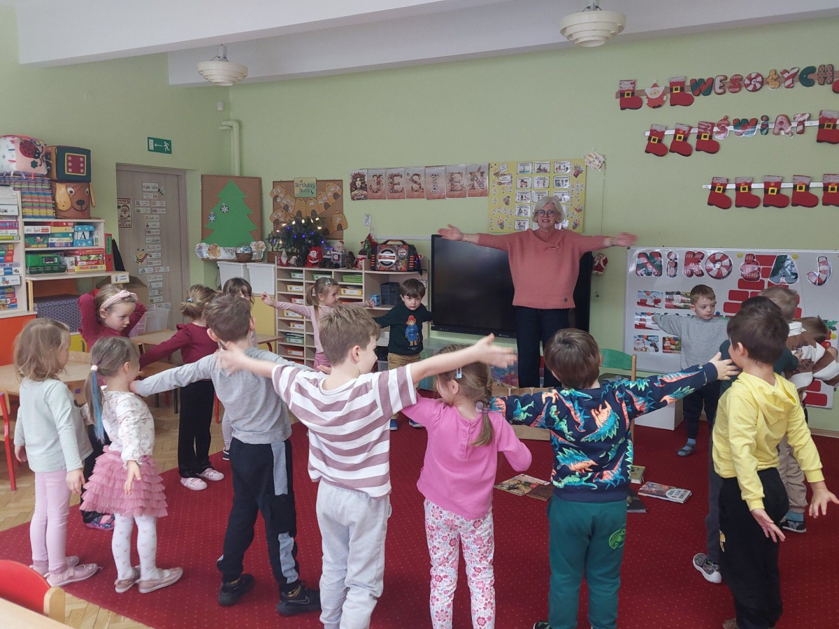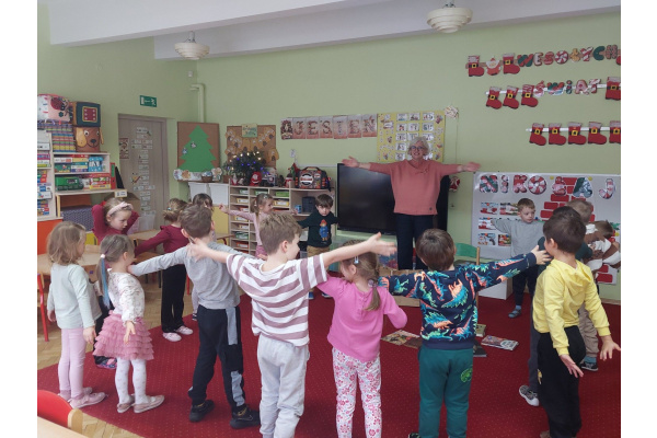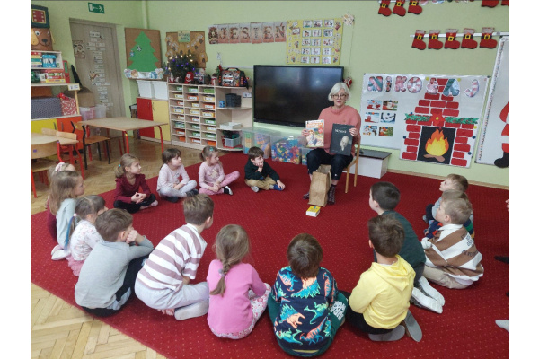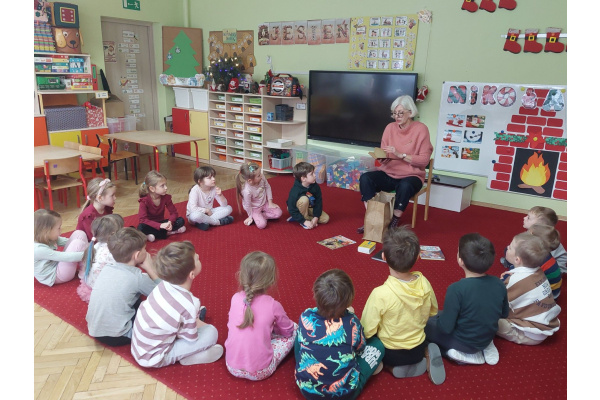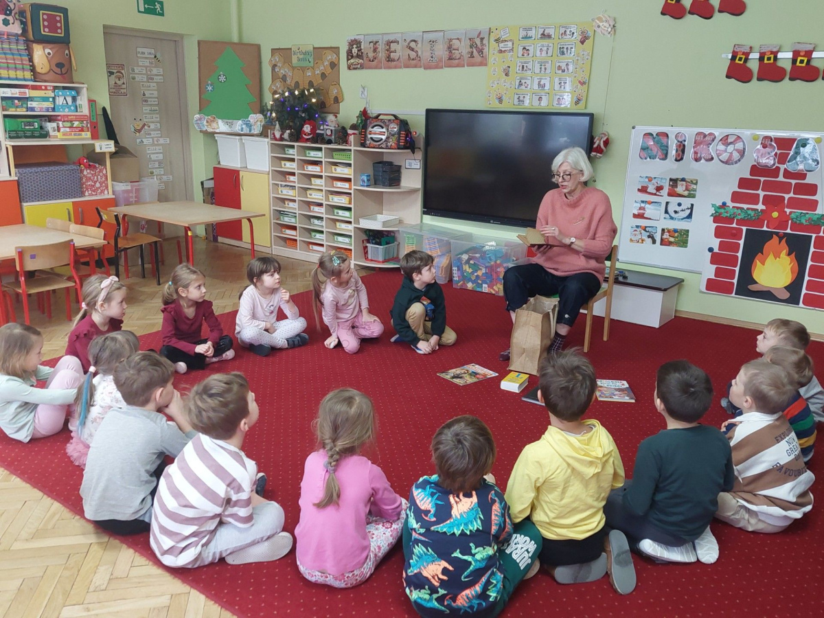 Naszą grupę odwiedziła p.Małgosia, która jest bibliotekarką w szkole. Opowiedziała dzieciom o swojej pracy, o rodzajach i budowie książek oraz o tym, jak dbać i szanować książki.