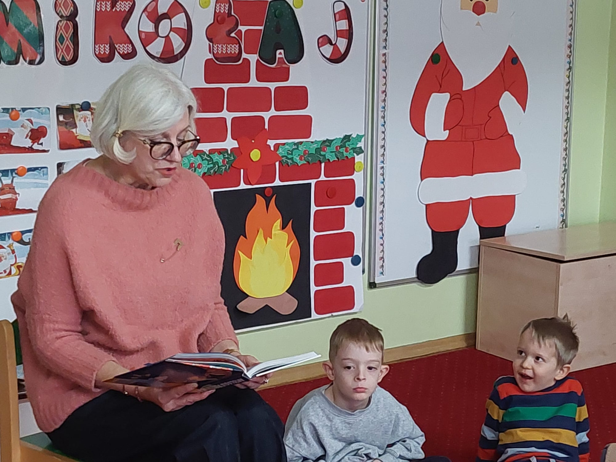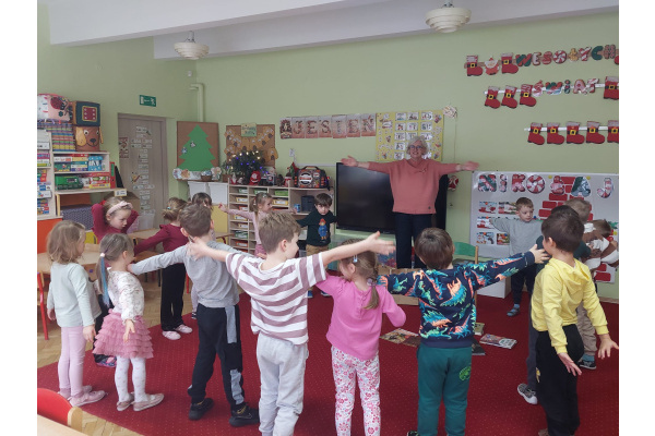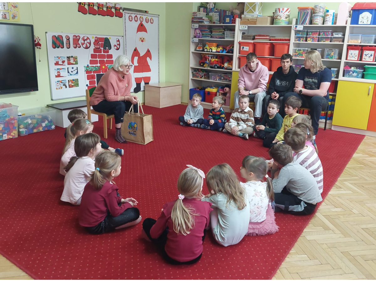 We wtorek 2 grudnia grupa ,,Pszczółki" gościła panią Małgosię pracującą w bibliotece Zespołu Szkół Elektrycznych oraz uczniów tej szkoły. Celem spotkania było rozbudzanie zainteresowań czytelniczych dzieci. Podczas rozmowy przedszkolaki wzbogaciły swoją wiedzę na temat biblioteki, zasad zachowania się w niej oraz zasad korzystania z książek. Pani Małgosia omówiła także wspólnie z dziećmi różnice w wyglądzie książek oraz ich elementy budowy - okładka, tytuł, grzbiet, ilustracje, strony. Na koniec przeczytała zabawny wierszyk o ślimaku.