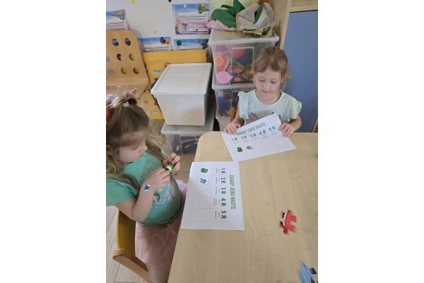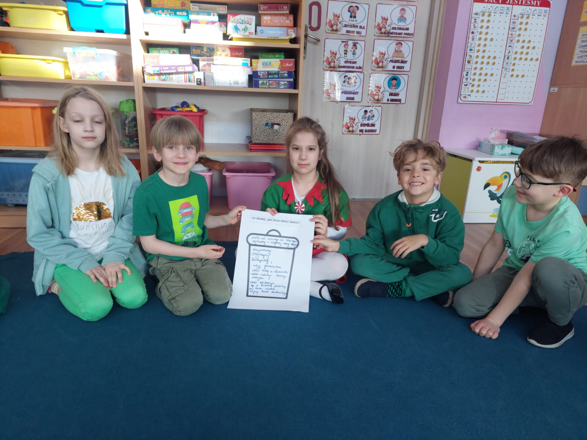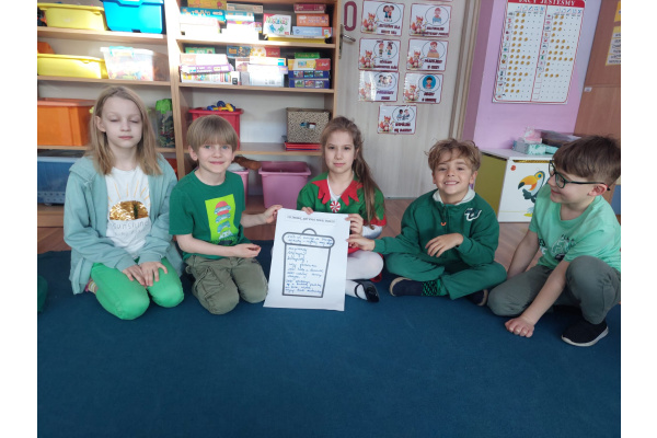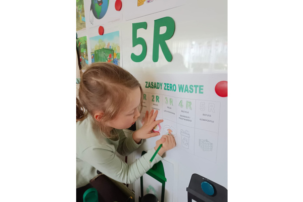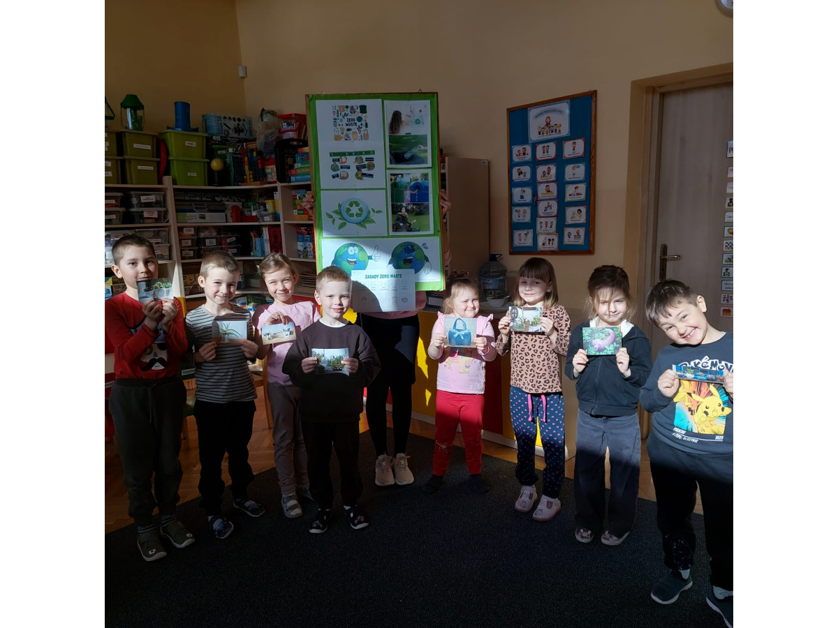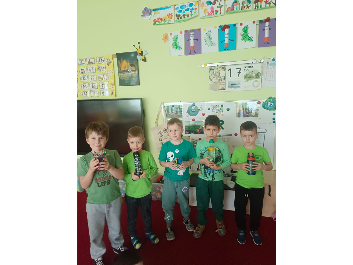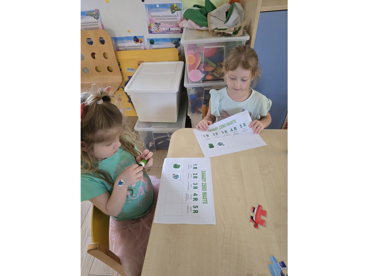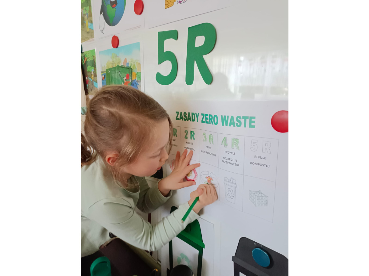 Poznaliśmy zasady nowego stylu życia „zero waste” w tym zasadę „5R”. Dużo rozmawialiśmy o tym, jak generować jak najmniejszą ilość odpadów (szczególnie kartki, chusteczki). Wiemy jak ważna jest segregacja śmieci. Staraliśmy się wdrażać zasady zero waste w codziennych czynnościach.