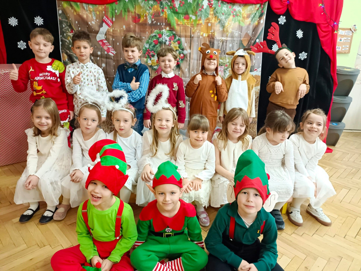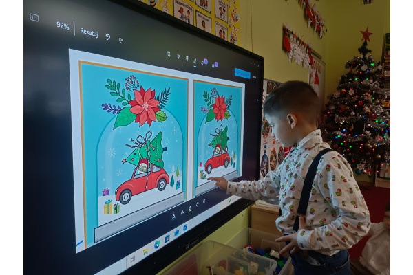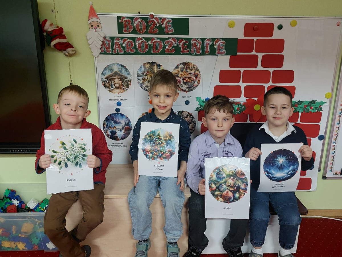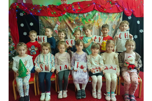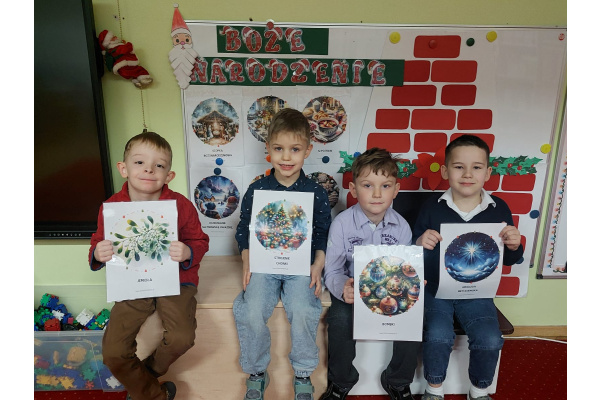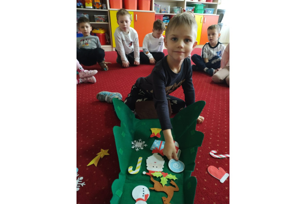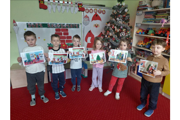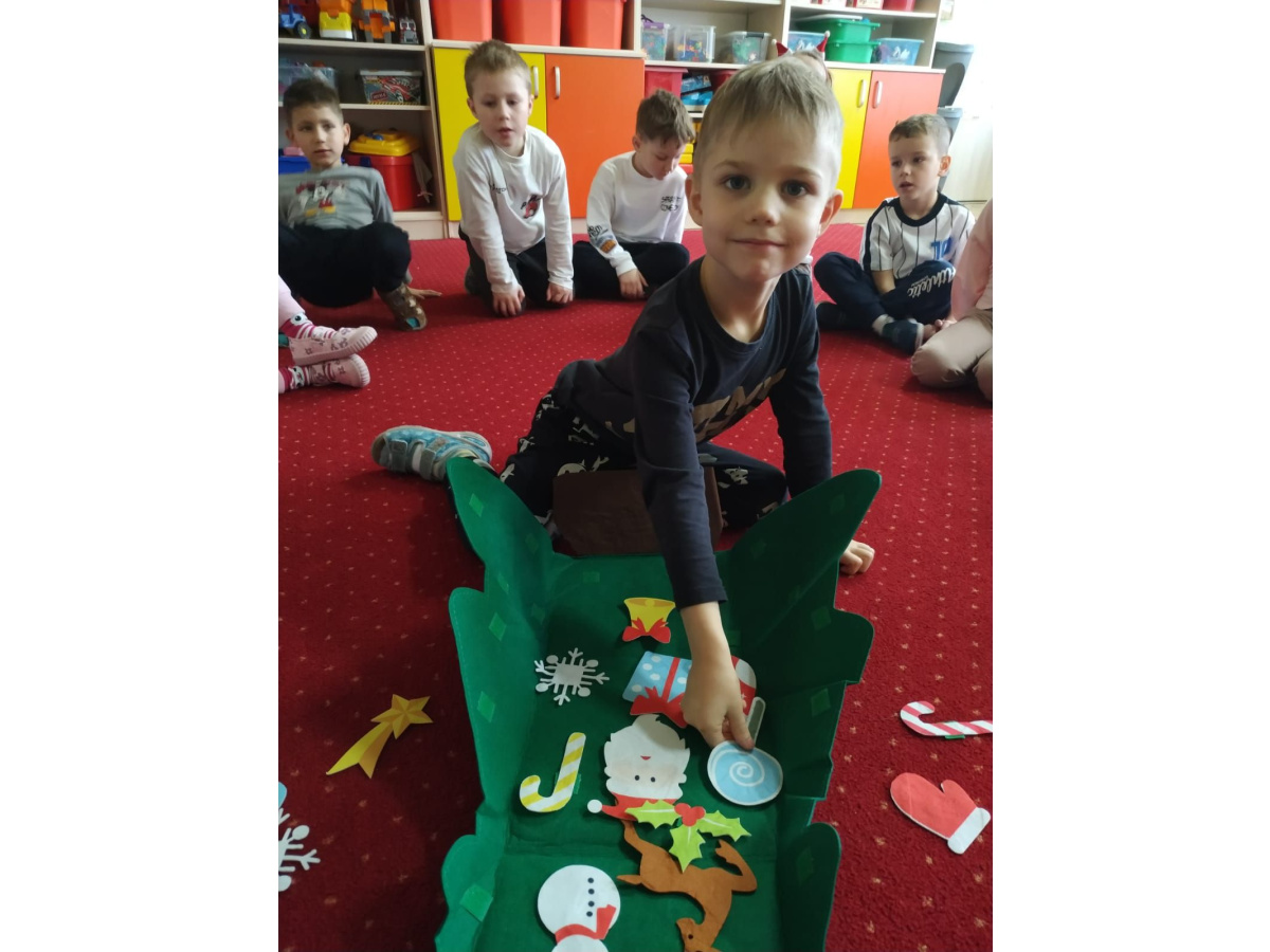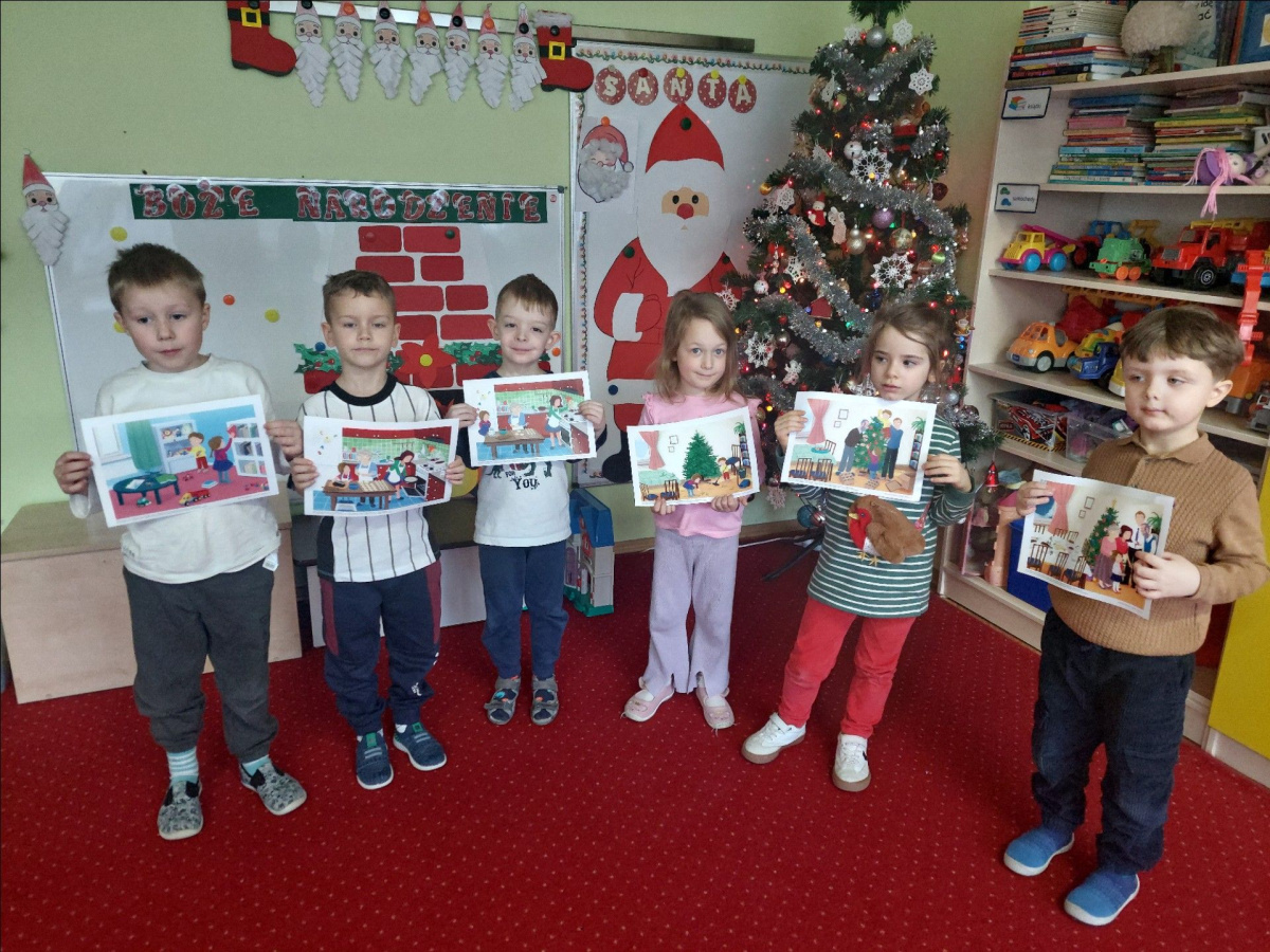 - aktywnie uczestniczy w przygotowaniach do Świąt Bożego Narodzenia: przygotowanie niespodzianek dla najbliższych, pomoc w wykonaniu dekoracji świątecznych sali, wspólne przygotowanie uroczystości – wigilii przedszkolnej,
