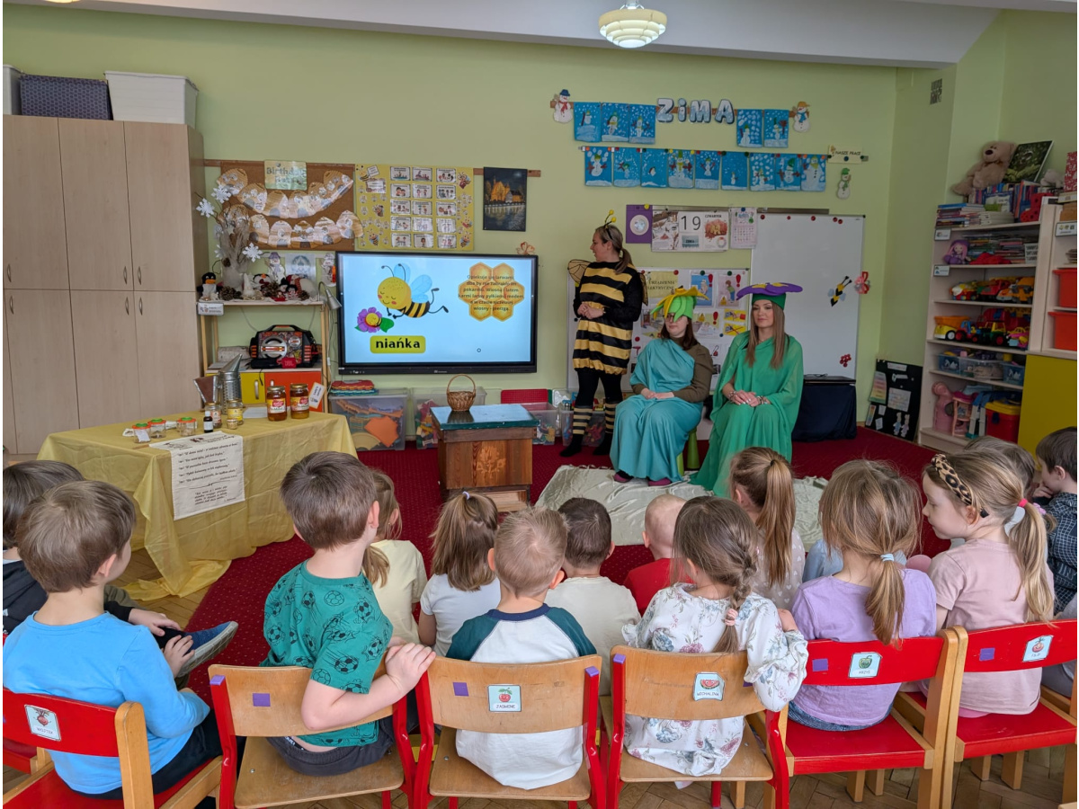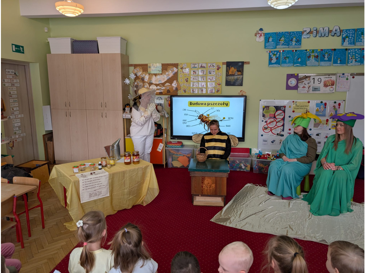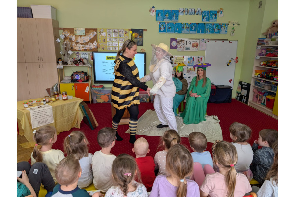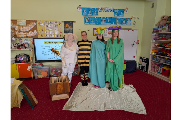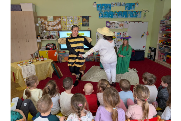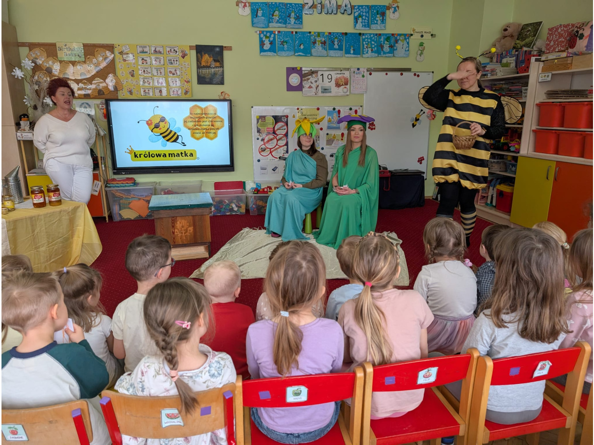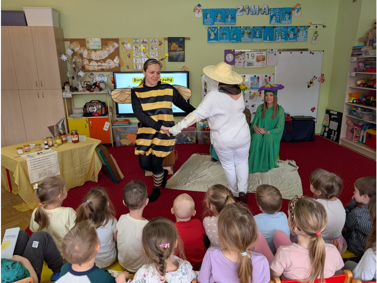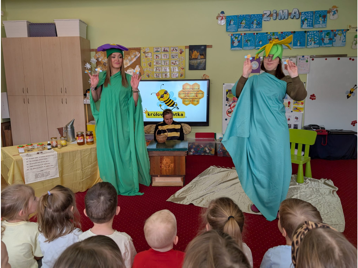 Grupa Pszczółek i Biedronek miała także okazję obejrzeć krótkie przedstawienie pt. „Pszczółka Bzyczka i Pan Miodek” w wykonaniu Pani Marty, Pani Justyny, Ms. Hani oraz Ms. Natalii. Spektakl w ciekawy i przystępny sposób pokazał dzieciom drogę od nektaru do słodkiego miodku. Towarzysząca przedstawieniu prezentacja multimedialna przybliżyła budowę pszczoły oraz mieszkańców ula.