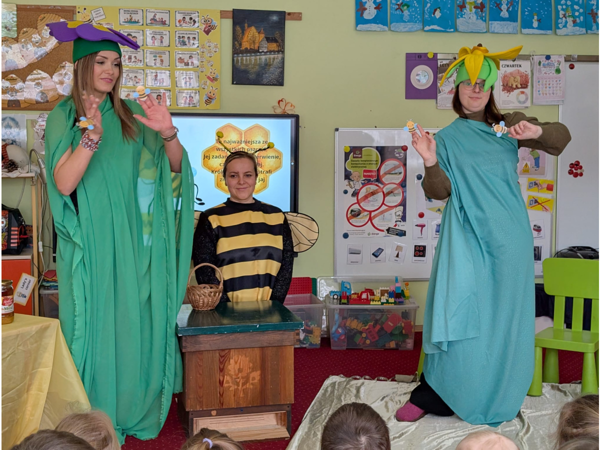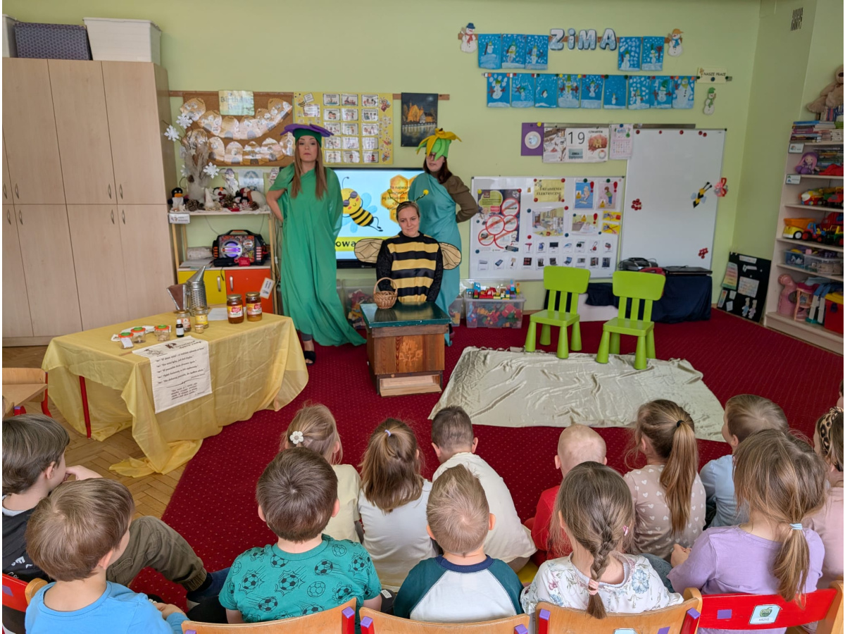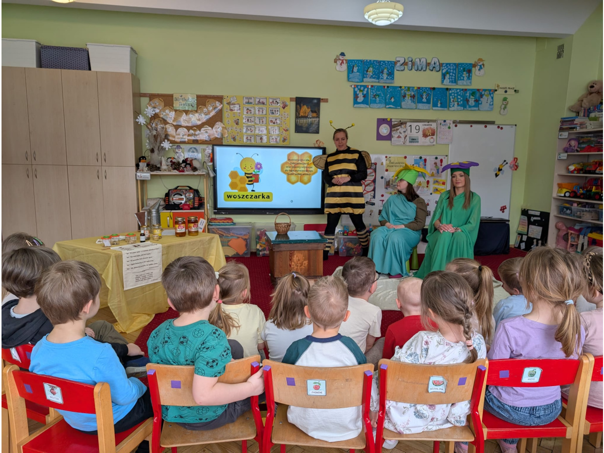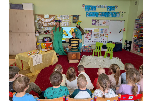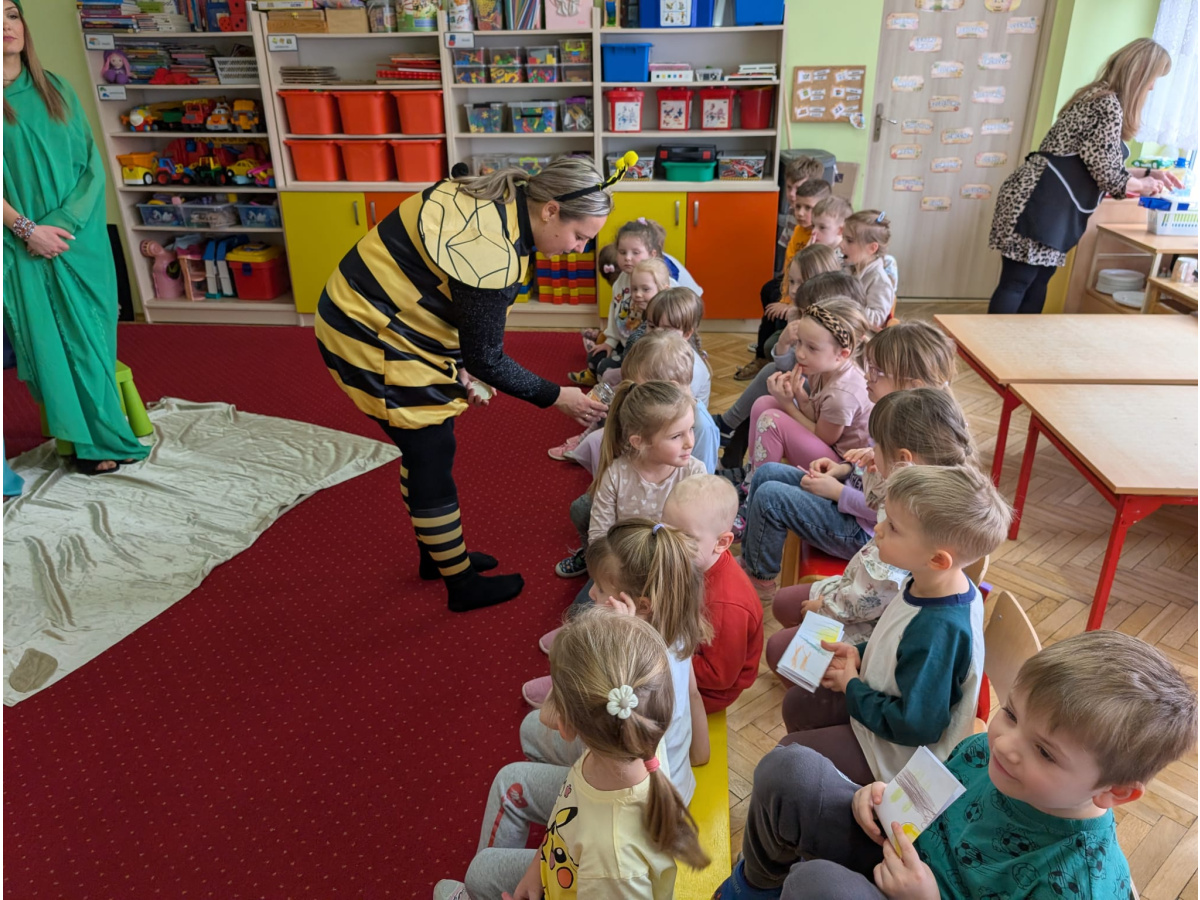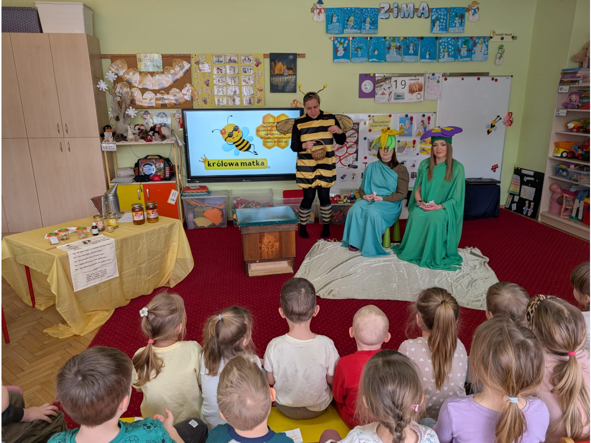 Grupa Pszczółek i Biedronek miała także okazję obejrzeć krótkie przedstawienie pt. „Pszczółka Bzyczka i Pan Miodek” w wykonaniu Pani Marty, Pani Justyny, Ms. Hani oraz Ms. Natalii. Spektakl w ciekawy i przystępny sposób pokazał dzieciom drogę od nektaru do słodkiego miodku. Towarzysząca przedstawieniu prezentacja multimedialna przybliżyła budowę pszczoły oraz mieszkańców ula.