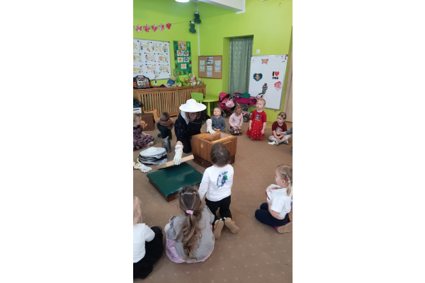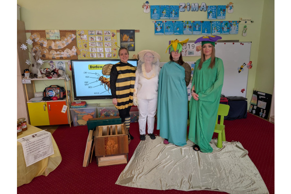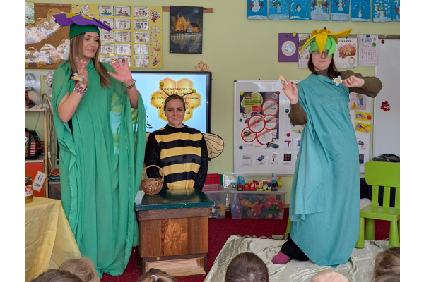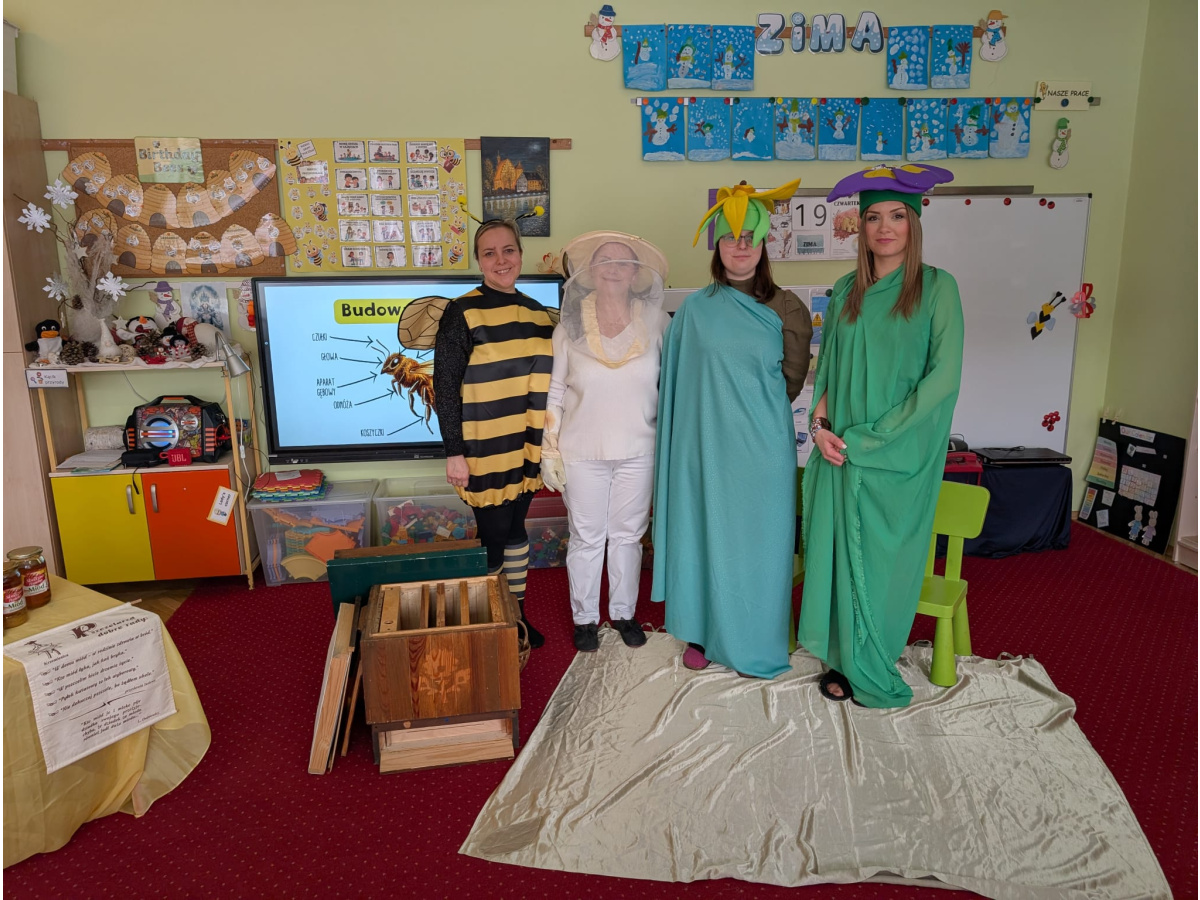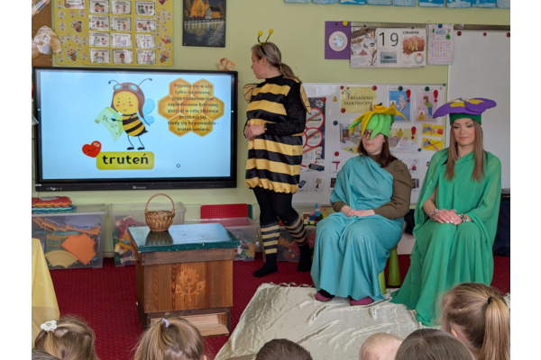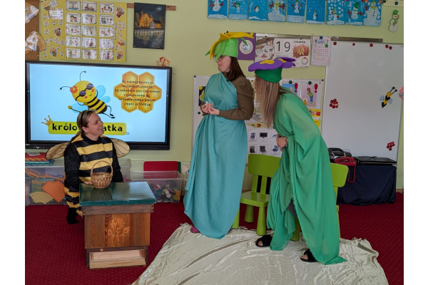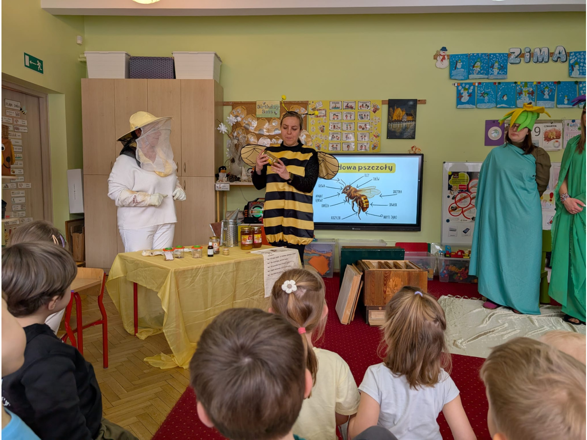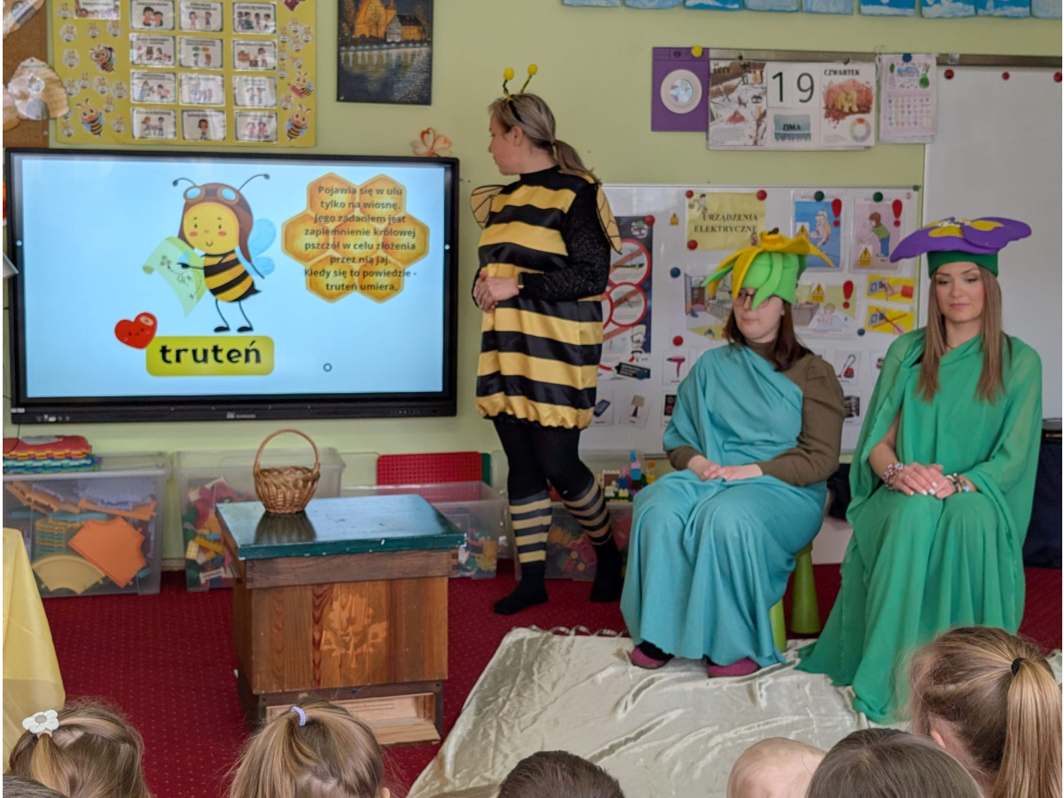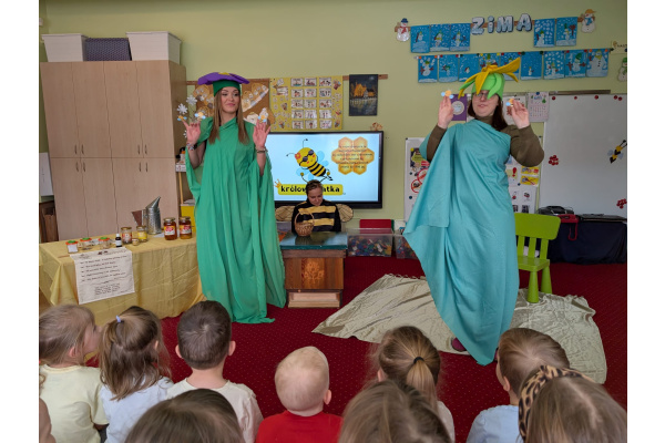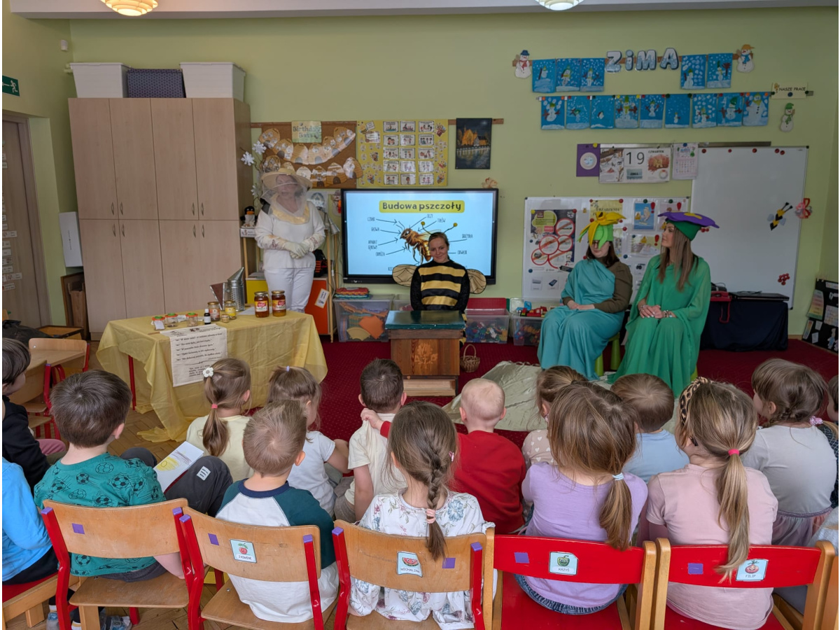 Grupa Pszczółek i Biedronek miała także okazję obejrzeć krótkie przedstawienie pt. „Pszczółka Bzyczka i Pan Miodek” w wykonaniu Pani Marty, Pani Justyny, Ms. Hani oraz Ms. Natalii. Spektakl w ciekawy i przystępny sposób pokazał dzieciom drogę od nektaru do słodkiego miodku. Towarzysząca przedstawieniu prezentacja multimedialna przybliżyła budowę pszczoły oraz mieszkańców ula.
