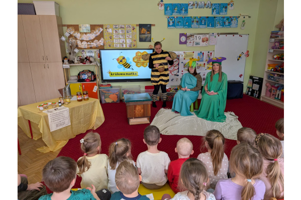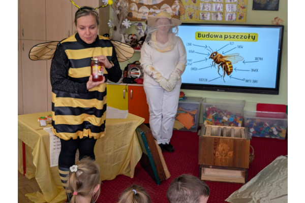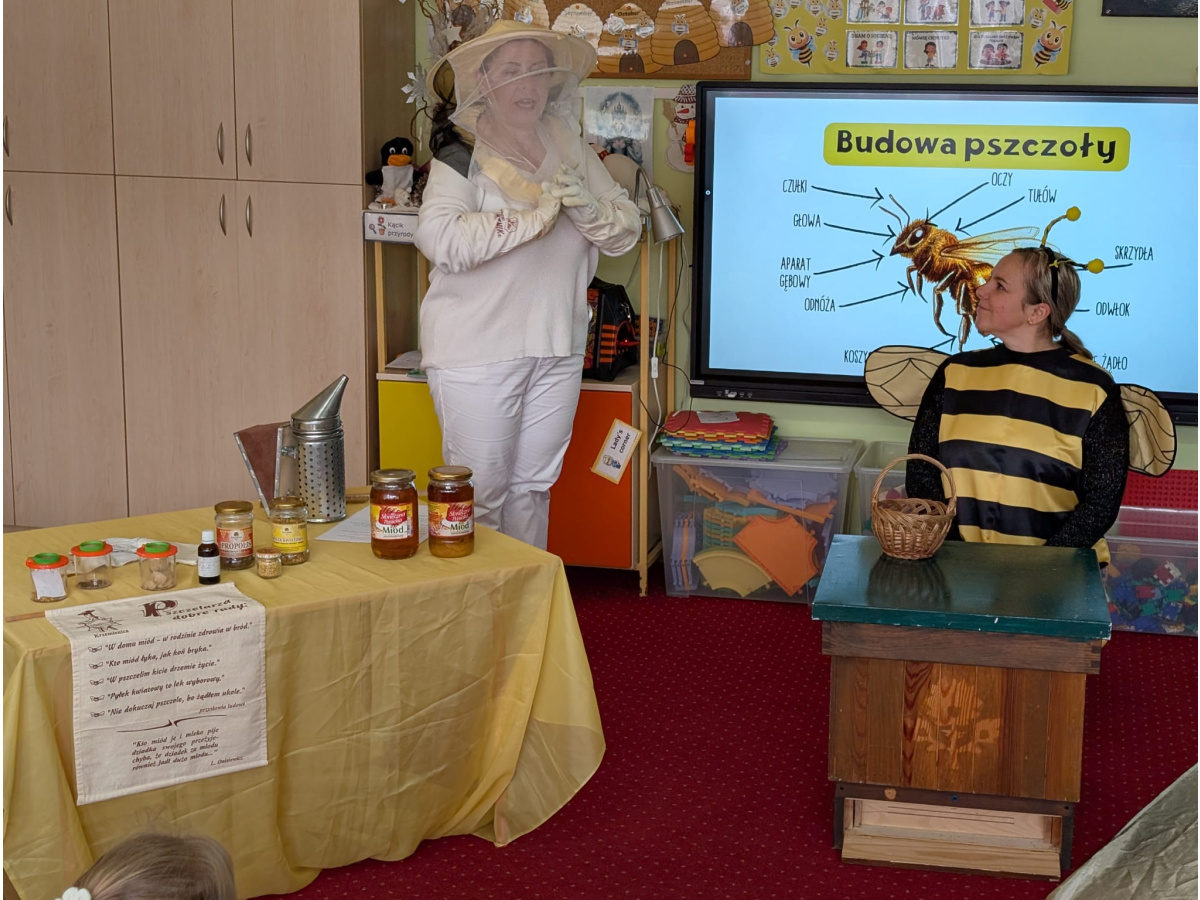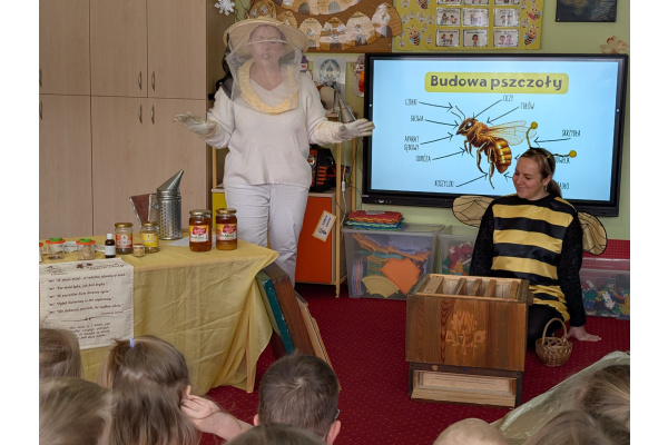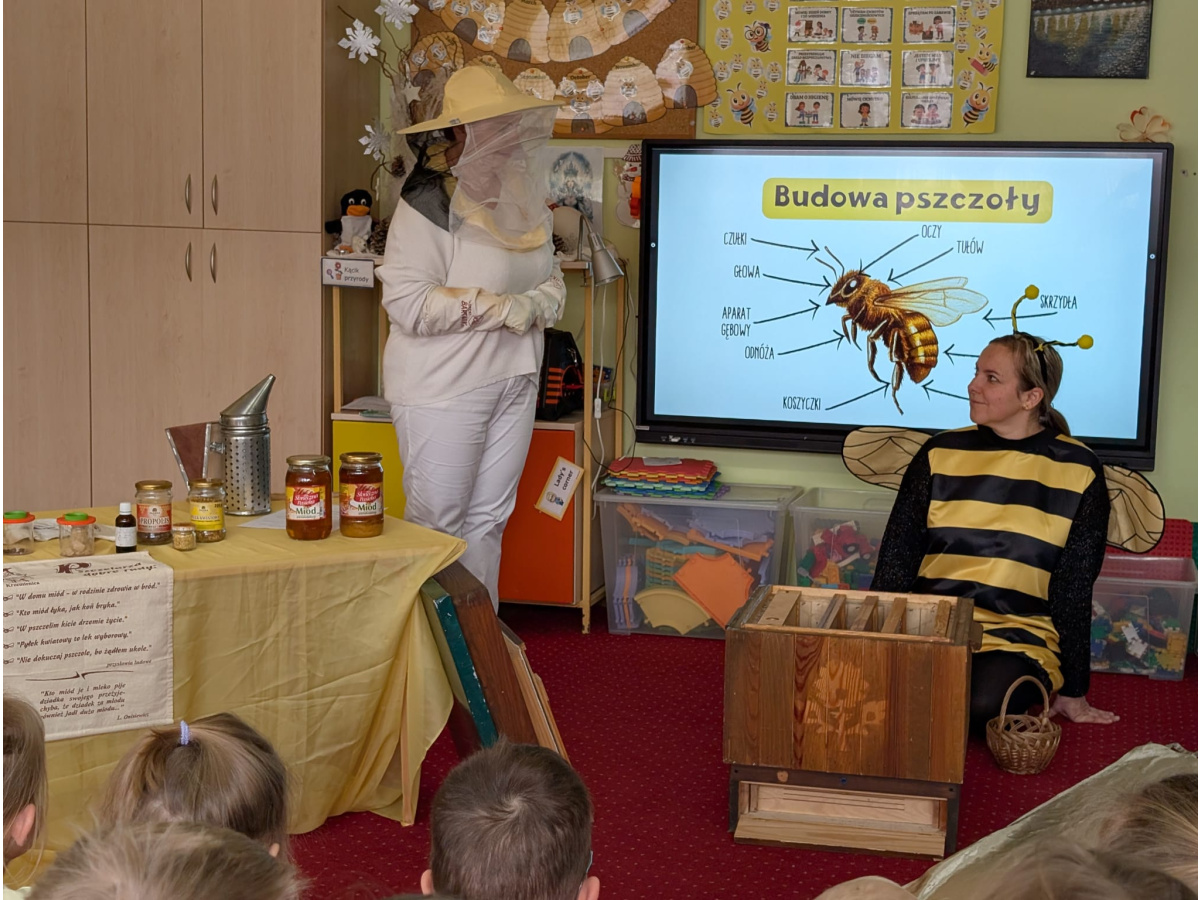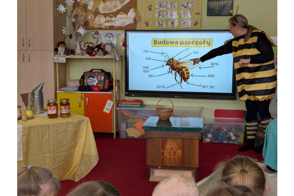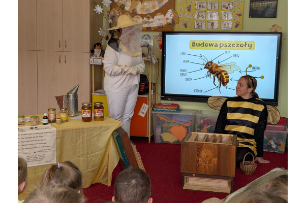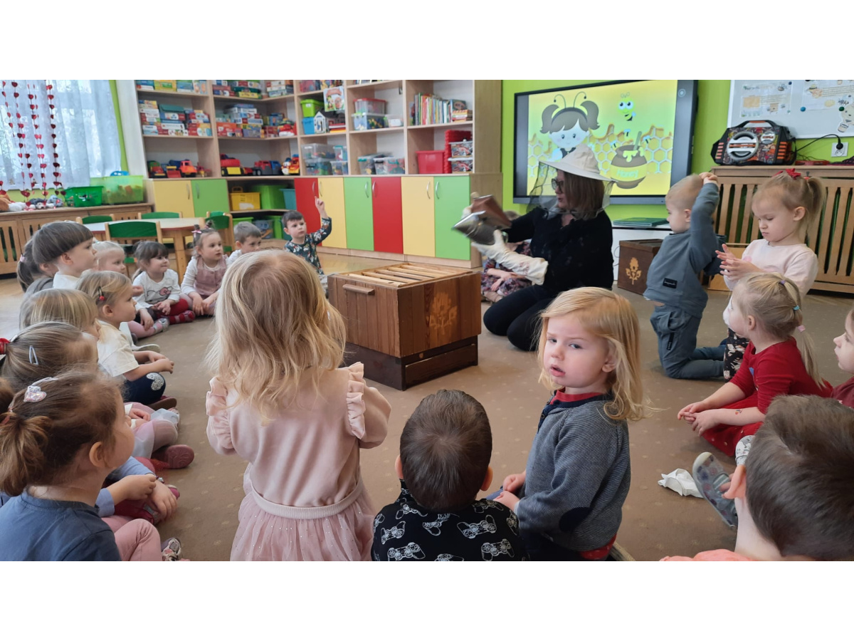 Podczas spotkania dzieci mogły zobaczyć, jak wygląda prawdziwy ul oraz dowiedzieć się, z jakich elementów jest zbudowany. Poznały jego wnętrze i dowiedziały się, kto jest jego mieszkańcem. Przedszkolaki zdobyły wiedzę na temat tego, w jaki sposób pszczoły zbierają nektar z kwiatów, a następnie przetwarzają go, tworząc miód.