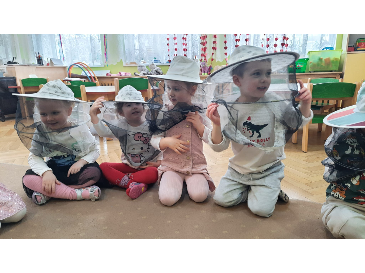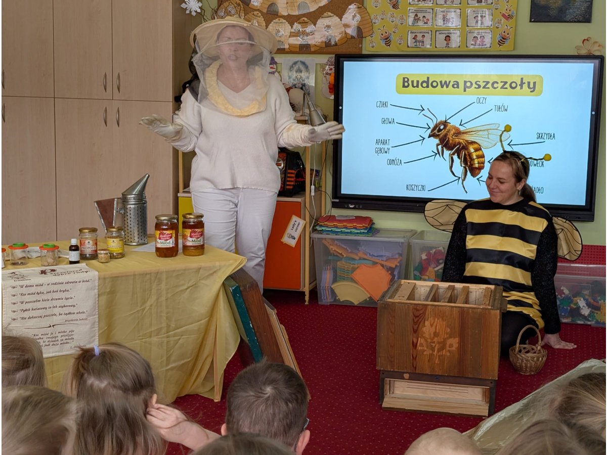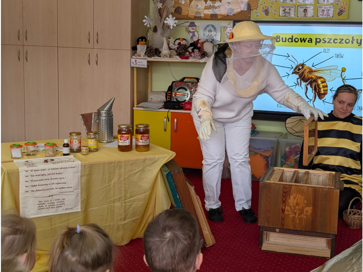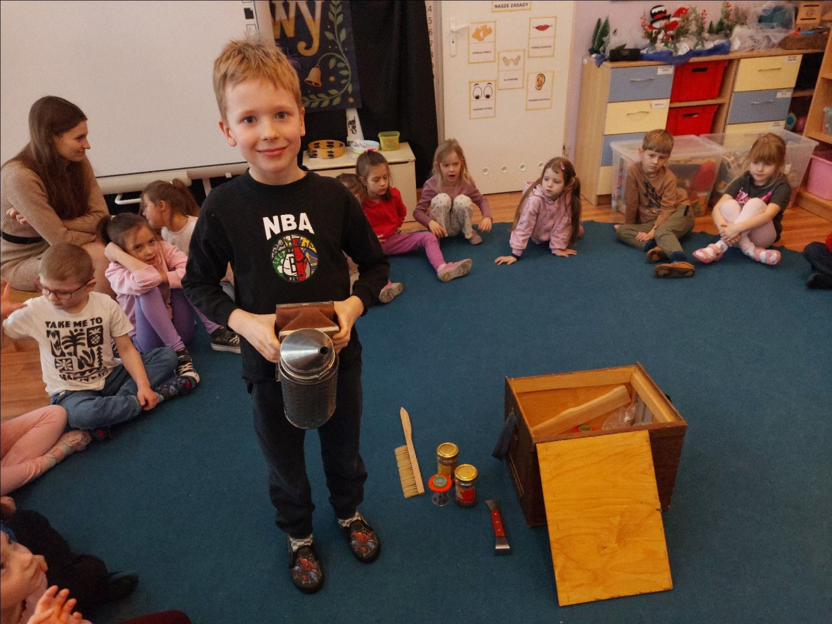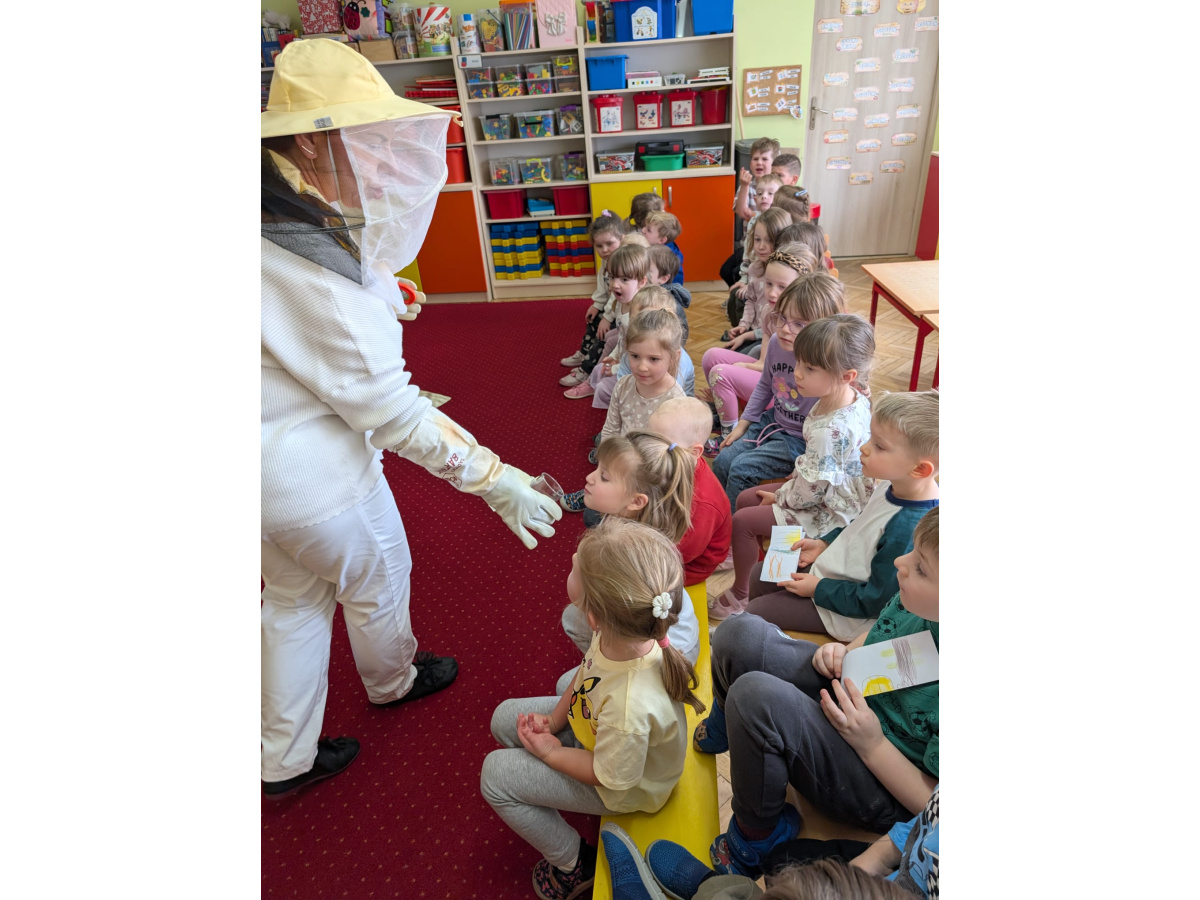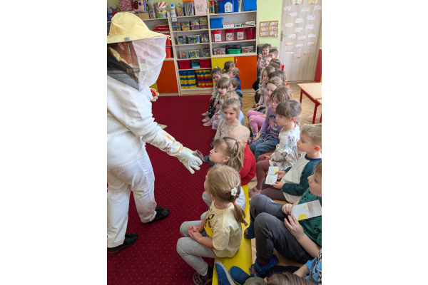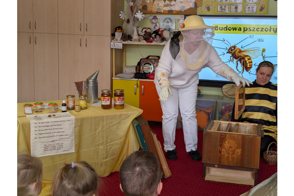 Dzieci poznały również pracę pszczelarza – dowiedziały się, na czym polega jego zawód, jak opiekuje się pszczołami oraz jak bezpiecznie pozyskuje miód.