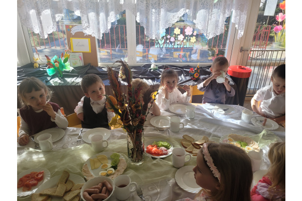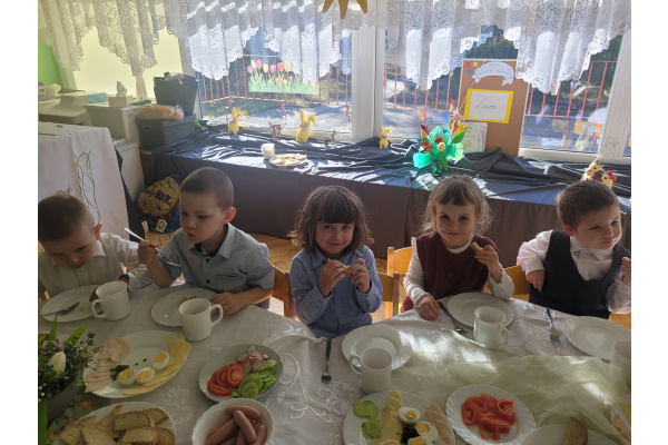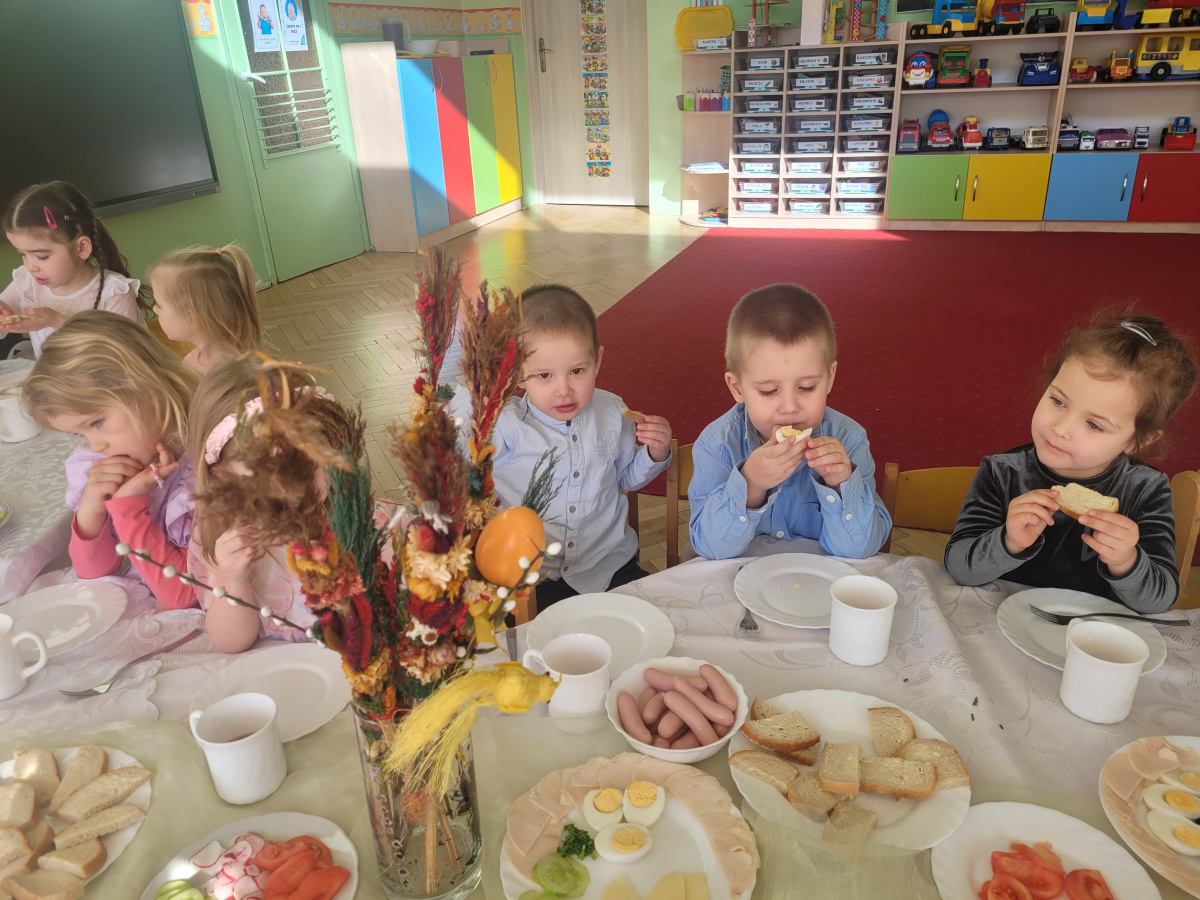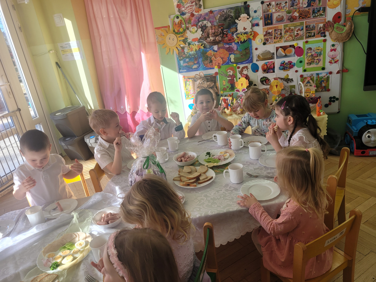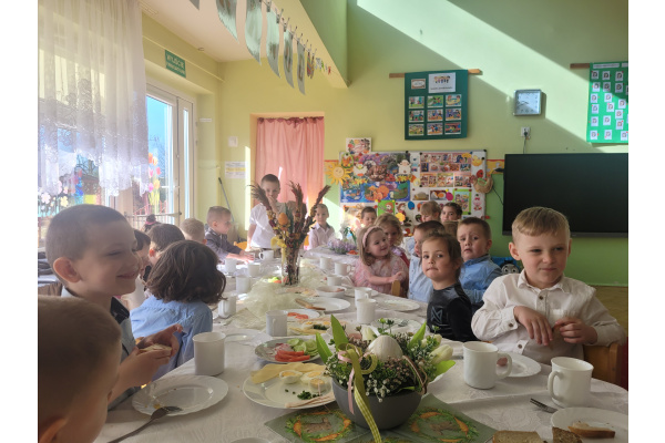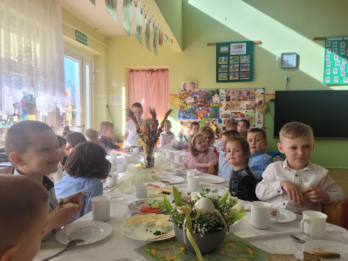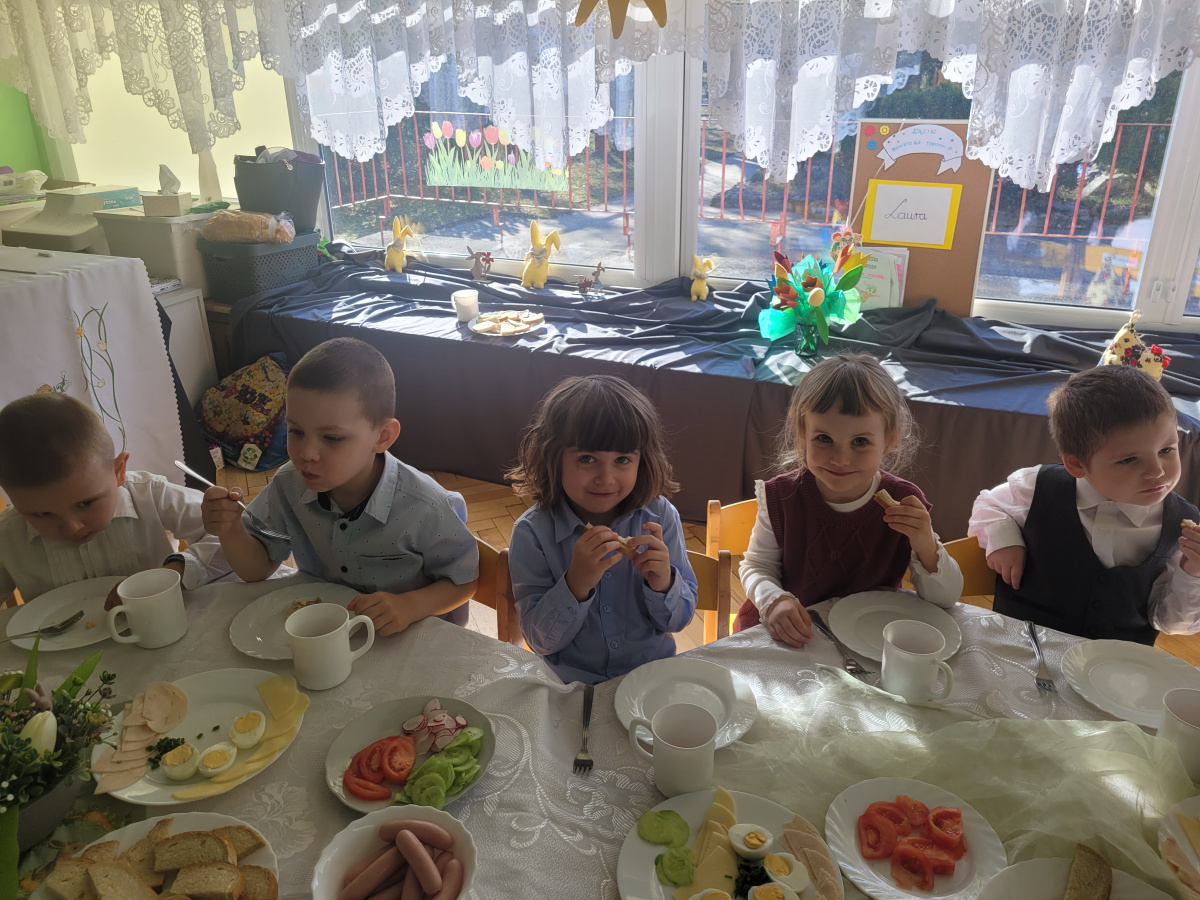 Odświętne ubrane dzieci zasiadły do wspólnego Wielkanocnego Śniadanka