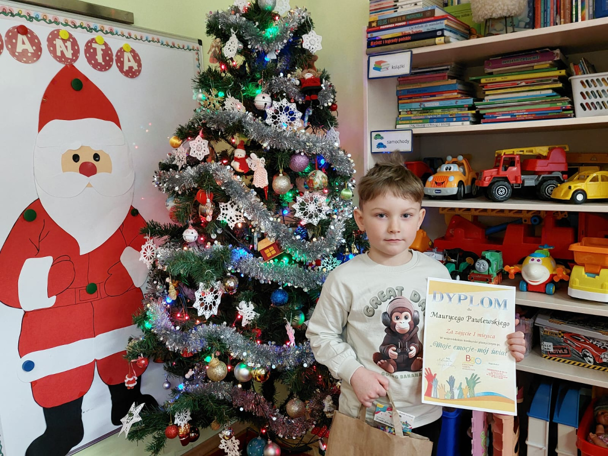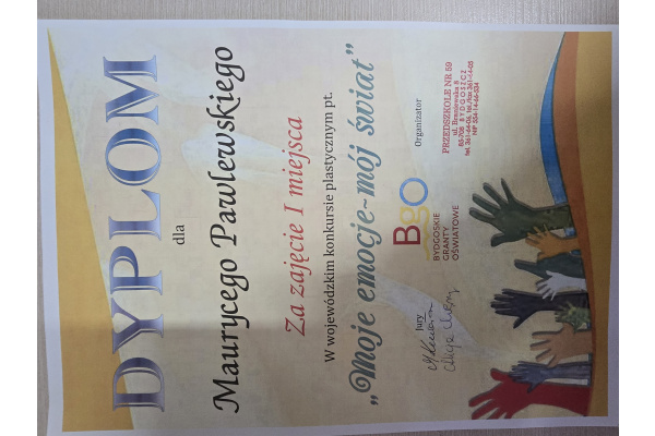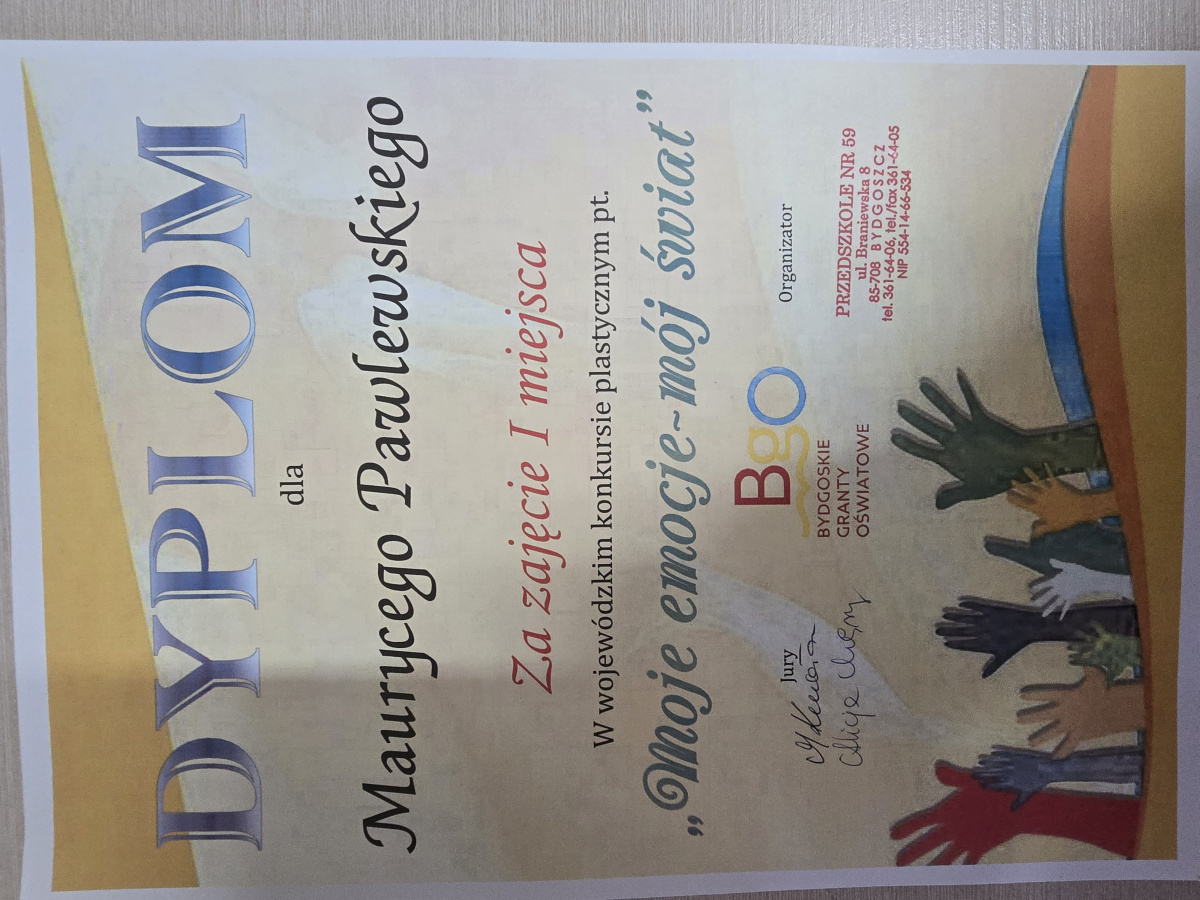 Jest nam bardzo miło poinformować, że Maurycy z grupy "Pszczółki" zdobył 1-sze miejsce w wojewódzkim konkursie plastycznym "Moje emocje - Mój świat"