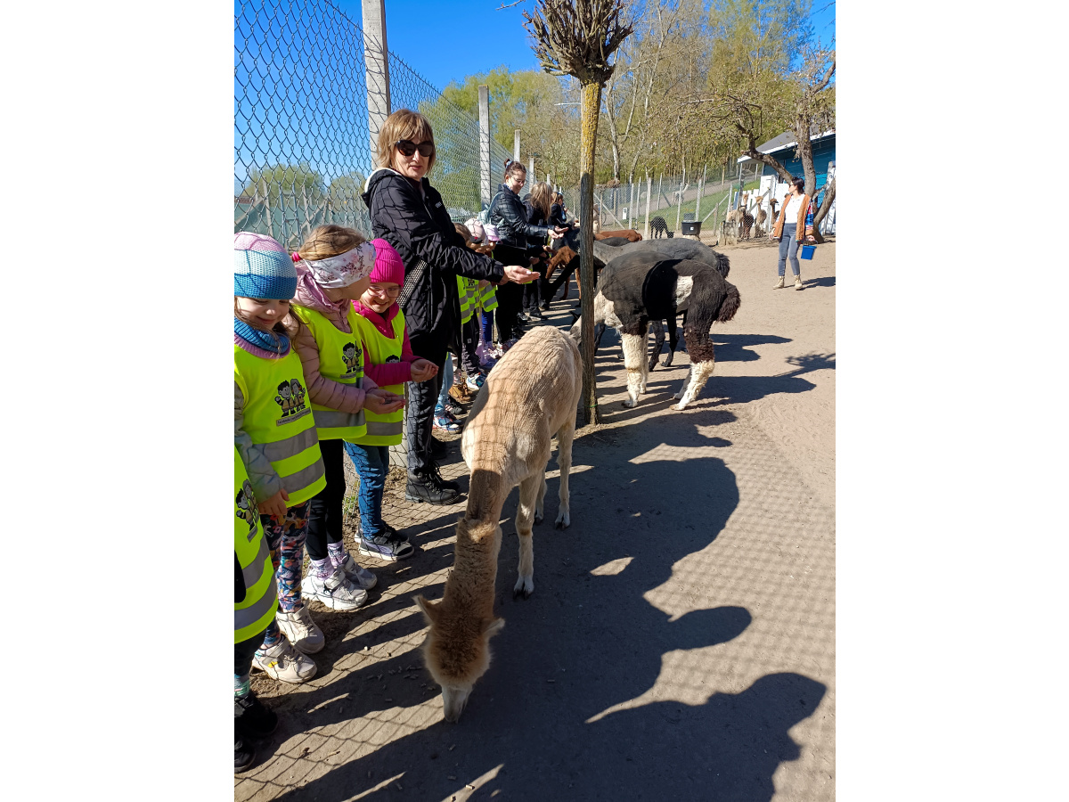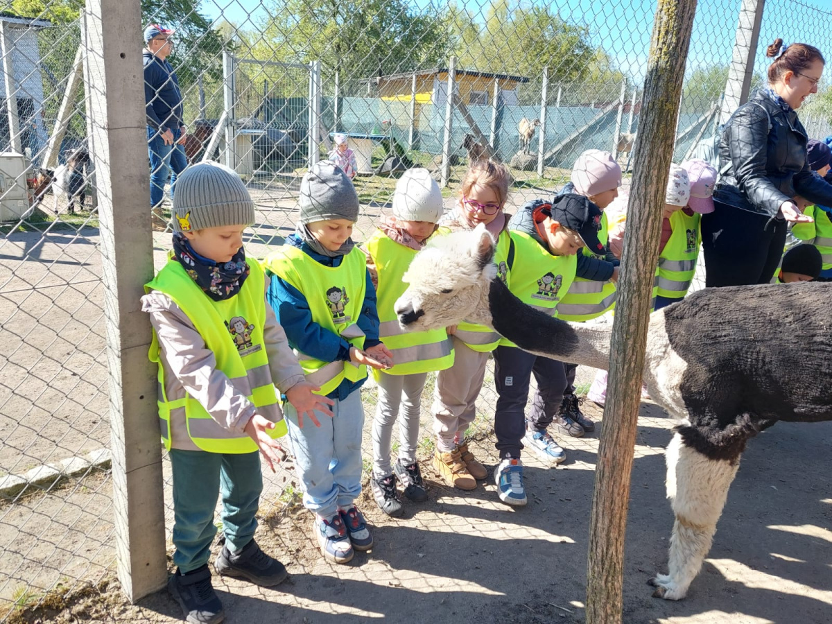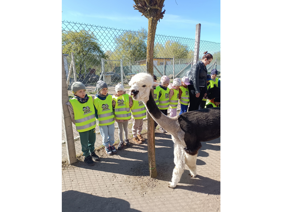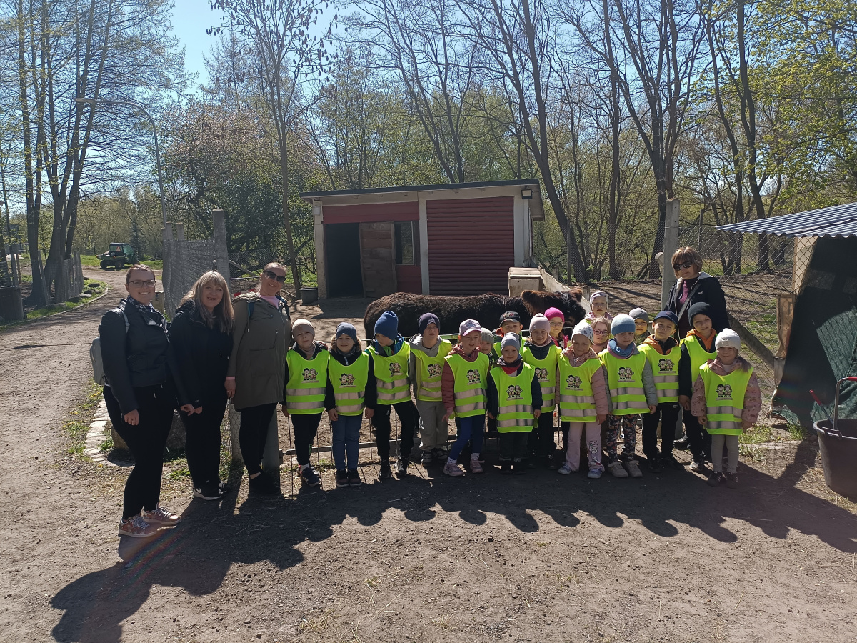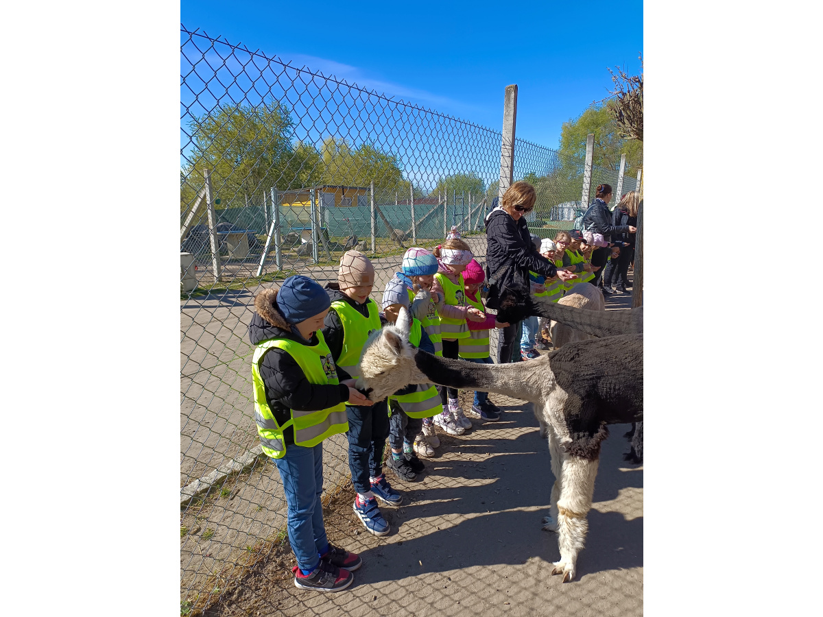 Odwiedziliśmy Krainę Dolnej Wisły - bardzo piękne miejsce, pełne zwierząt i cudnej przyrody! Wszystkim nam się bardzo podobało, a miejsce było przepiękne, szczególnie wiosną - kiedy wszystko kwitnie, w zagrodach są małe, dopiero co urodzone zwierzątka! Podczas pobytu mieliśmy okazję poznać wiele różnych zwierząt takich jak: alpaki, owce walliserskie, osły Poitou, kozy anglonubijskie. Widzieliśmy też białego kangura Walabia-Bennetta. Pierwszy raz zobaczylismy zwierzę o nazwie mara patagońska. Oprócz tego widzieliśmy kozy, papugi, kury i koguty, pawie oraz emu. Największą atrakcją były alpaki, które chętnie jadły nam z ręki, co sprawiło nam dużo radości. Dla kóz przygotowaliśmy „szwedzki stół”, dzięki czemu mogliśmy je obserwować z bliska i zobaczyć ich zwyczaje oraz poznać ich ulubione menu. Na własnej skórze przekonaliśmy się również, co oznacza powiedzenie „uparty jak osioł”. Cała wycieczka była nie tylko świetną zabawą, ale też wartościową lekcją o zwierzętach i przyrodzie! Malowaliśmy też gipsowe figurki zwierząt, a na koniec mieliśmy piknik w altance oraz zabawy na dmuchańcach. Było suuuuuper!