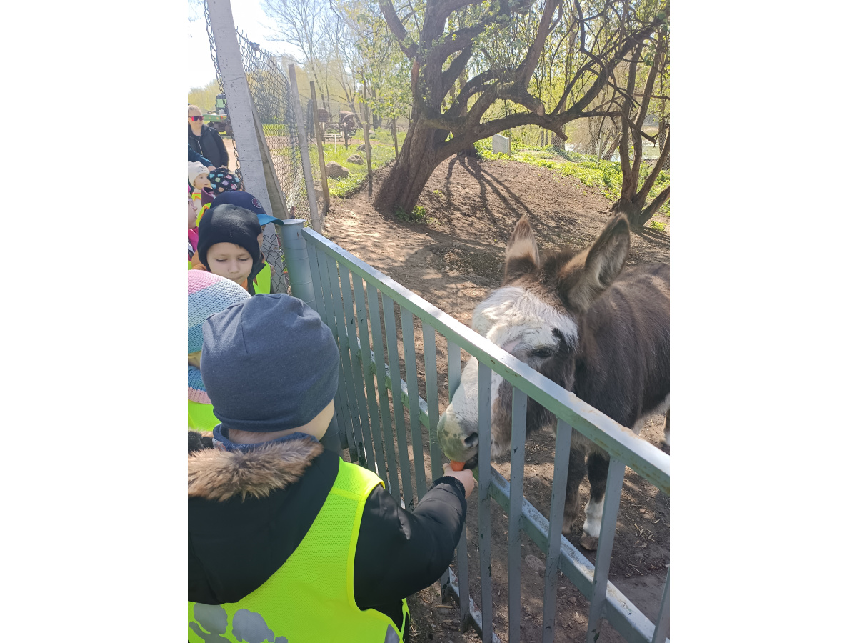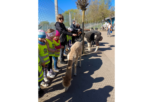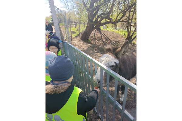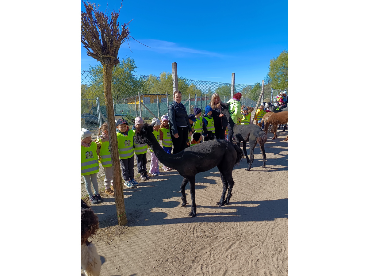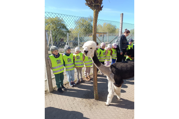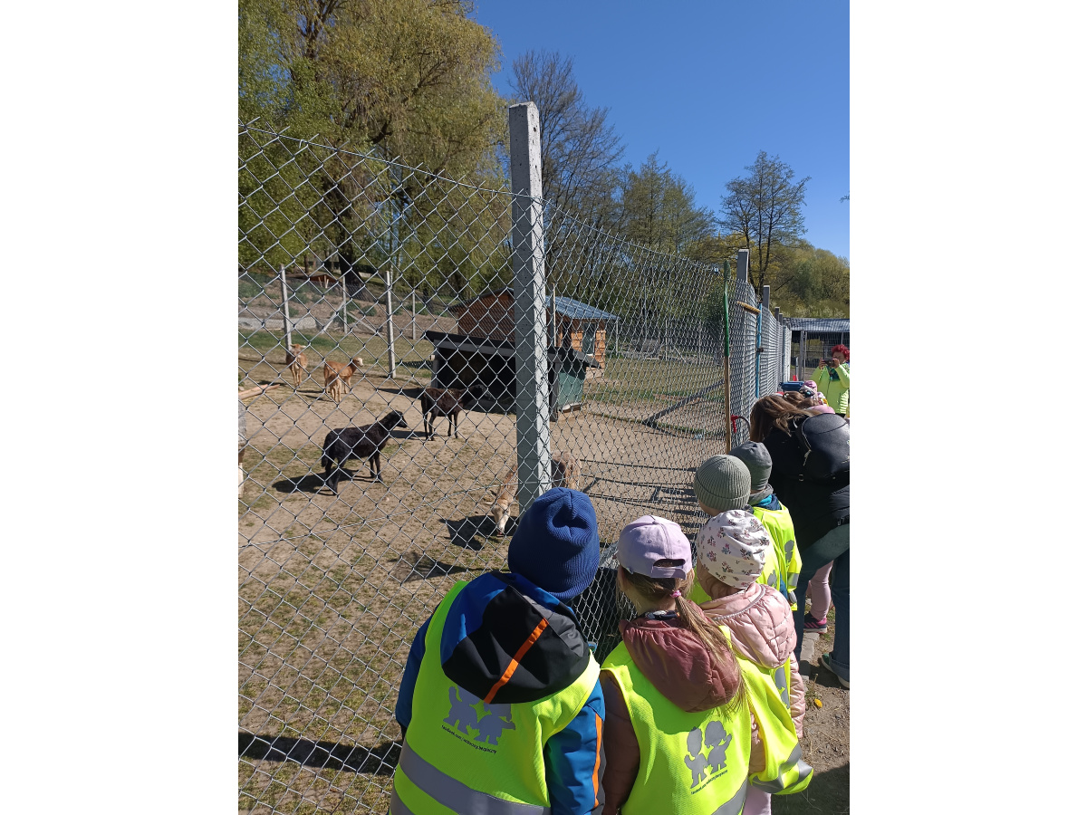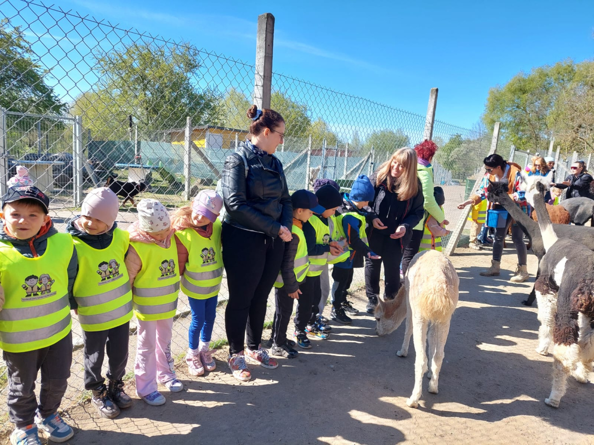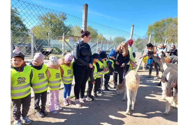 Odwiedziliśmy Krainę Dolnej Wisły - bardzo piękne miejsce, pełne zwierząt i cudnej przyrody! Wszystkim nam się bardzo podobało, a miejsce było przepiękne, szczególnie wiosną - kiedy wszystko kwitnie, w zagrodach są małe, dopiero co urodzone zwierzątka! Podczas pobytu mieliśmy okazję poznać wiele różnych zwierząt takich jak: alpaki, owce walliserskie, osły Poitou, kozy anglonubijskie. Widzieliśmy też białego kangura Walabia-Bennetta. Pierwszy raz zobaczylismy zwierzę o nazwie mara patagońska. Oprócz tego widzieliśmy kozy, papugi, kury i koguty, pawie oraz emu. Największą atrakcją były alpaki, które chętnie jadły nam z ręki, co sprawiło nam dużo radości. Dla kóz przygotowaliśmy „szwedzki stół”, dzięki czemu mogliśmy je obserwować z bliska i zobaczyć ich zwyczaje oraz poznać ich ulubione menu. Na własnej skórze przekonaliśmy się również, co oznacza powiedzenie „uparty jak osioł”. Cała wycieczka była nie tylko świetną zabawą, ale też wartościową lekcją o zwierzętach i przyrodzie! Malowaliśmy też gipsowe figurki zwierząt, a na koniec mieliśmy piknik w altance oraz zabawy na dmuchańcach. Było suuuuuper!