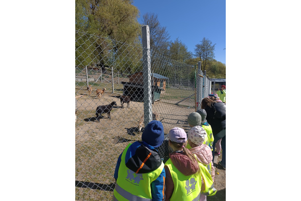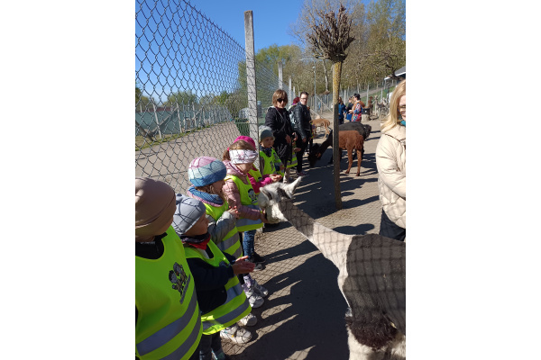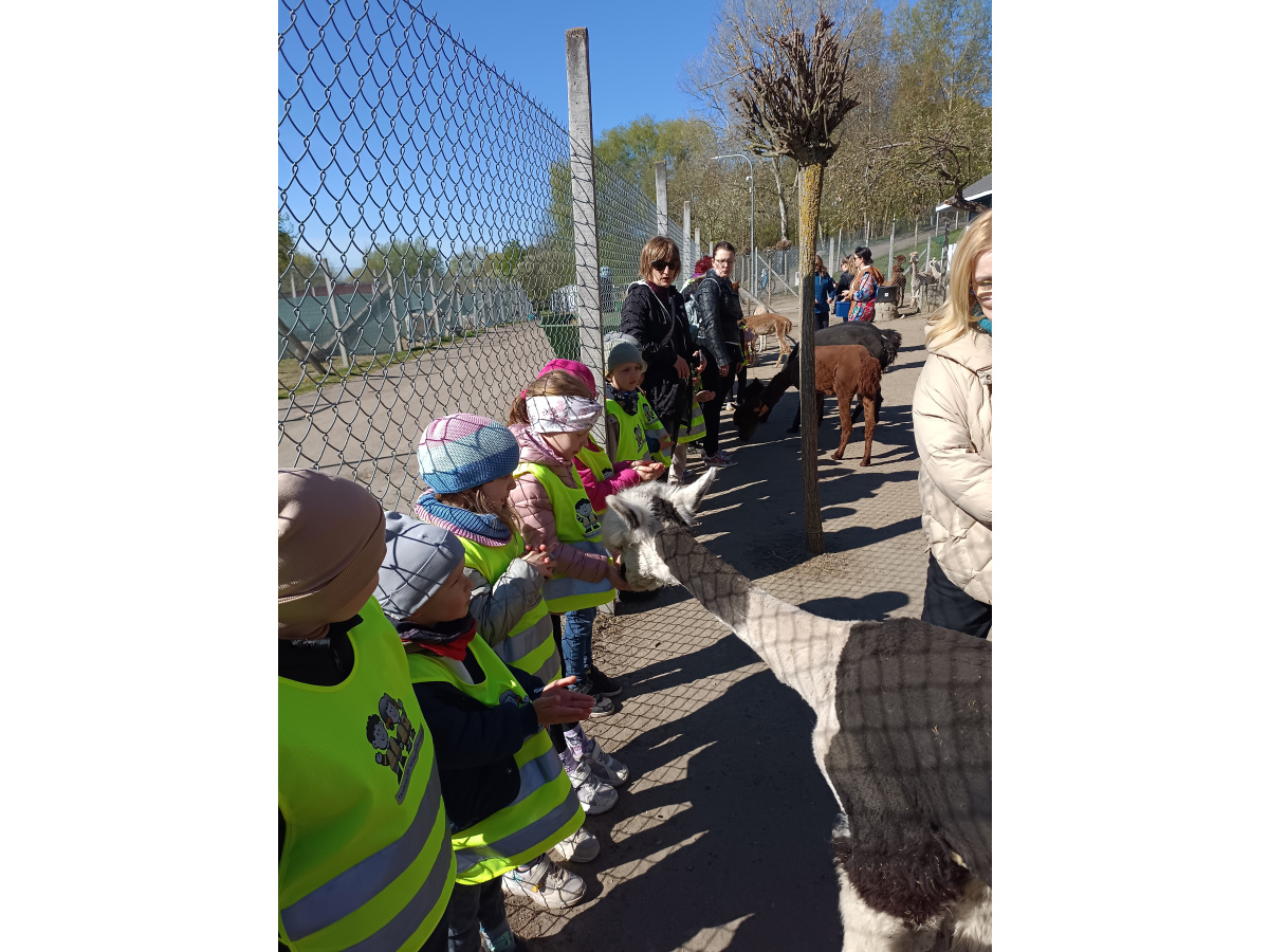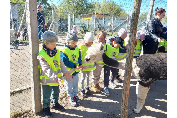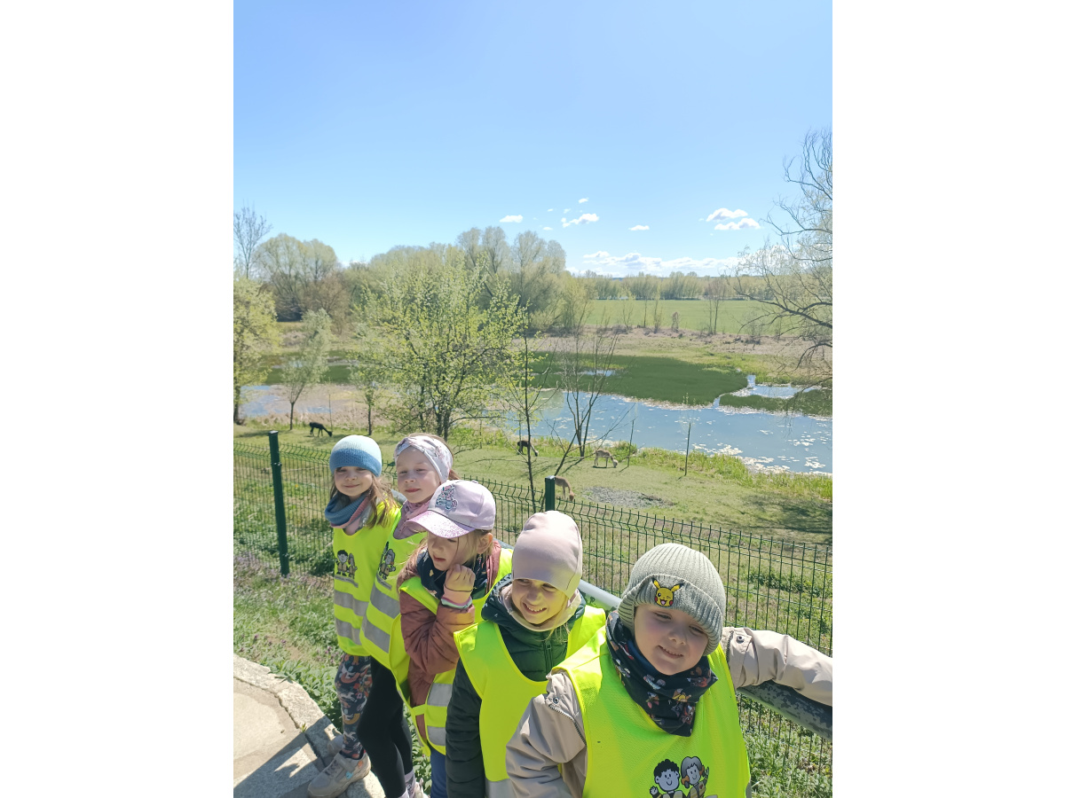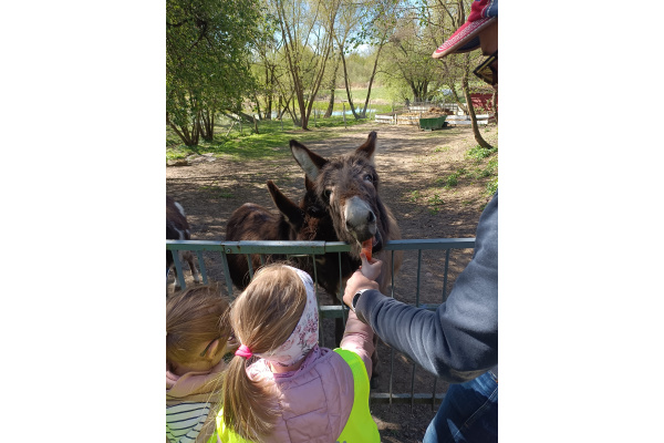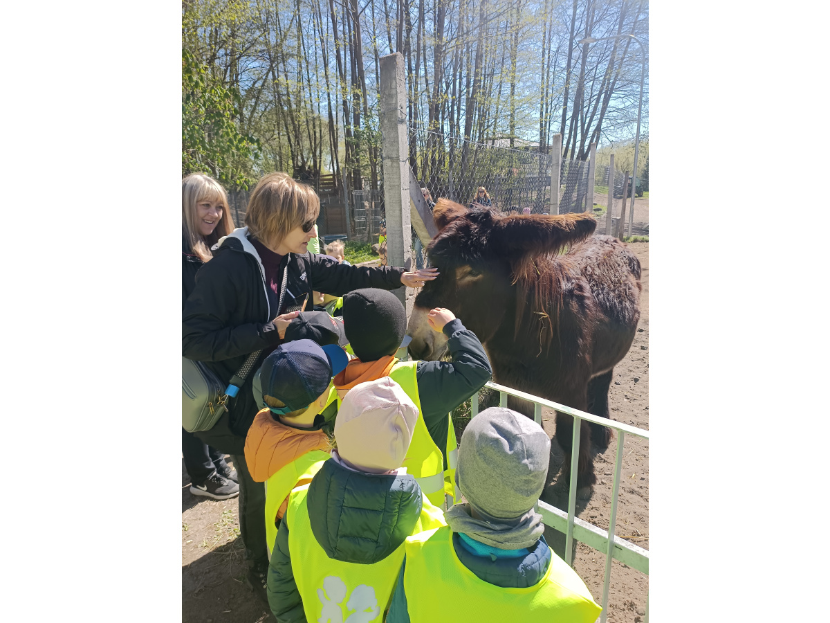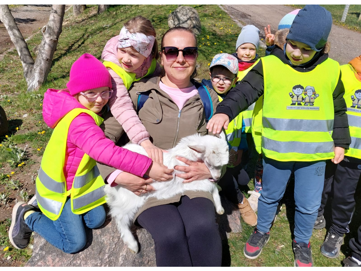 Odwiedziliśmy Krainę Dolnej Wisły - bardzo piękne miejsce, pełne zwierząt i cudnej przyrody! Wszystkim nam się bardzo podobało, a miejsce było przepiękne, szczególnie wiosną - kiedy wszystko kwitnie, w zagrodach są małe, dopiero co urodzone zwierzątka! Podczas pobytu mieliśmy okazję poznać wiele różnych zwierząt takich jak: alpaki, owce walliserskie, osły Poitou, kozy anglonubijskie. Widzieliśmy też białego kangura Walabia-Bennetta. Pierwszy raz zobaczylismy zwierzę o nazwie mara patagońska. Oprócz tego widzieliśmy kozy, papugi, kury i koguty, pawie oraz emu. Największą atrakcją były alpaki, które chętnie jadły nam z ręki, co sprawiło nam dużo radości. Dla kóz przygotowaliśmy „szwedzki stół”, dzięki czemu mogliśmy je obserwować z bliska i zobaczyć ich zwyczaje oraz poznać ich ulubione menu. Na własnej skórze przekonaliśmy się również, co oznacza powiedzenie „uparty jak osioł”. Cała wycieczka była nie tylko świetną zabawą, ale też wartościową lekcją o zwierzętach i przyrodzie! Malowaliśmy też gipsowe figurki zwierząt, a na koniec mieliśmy piknik w altance oraz zabawy na dmuchańcach. Było suuuuuper!