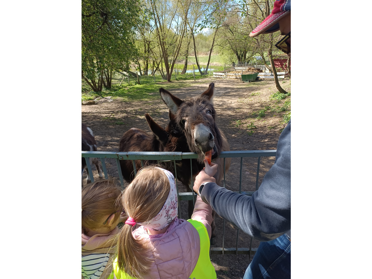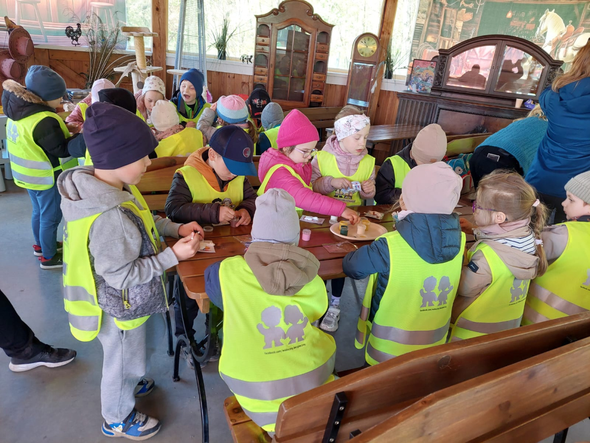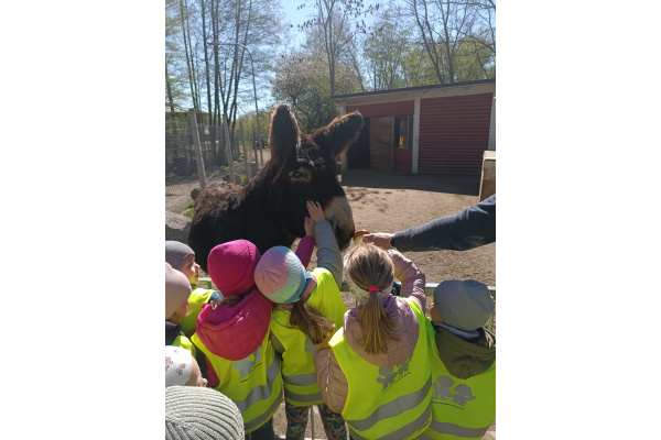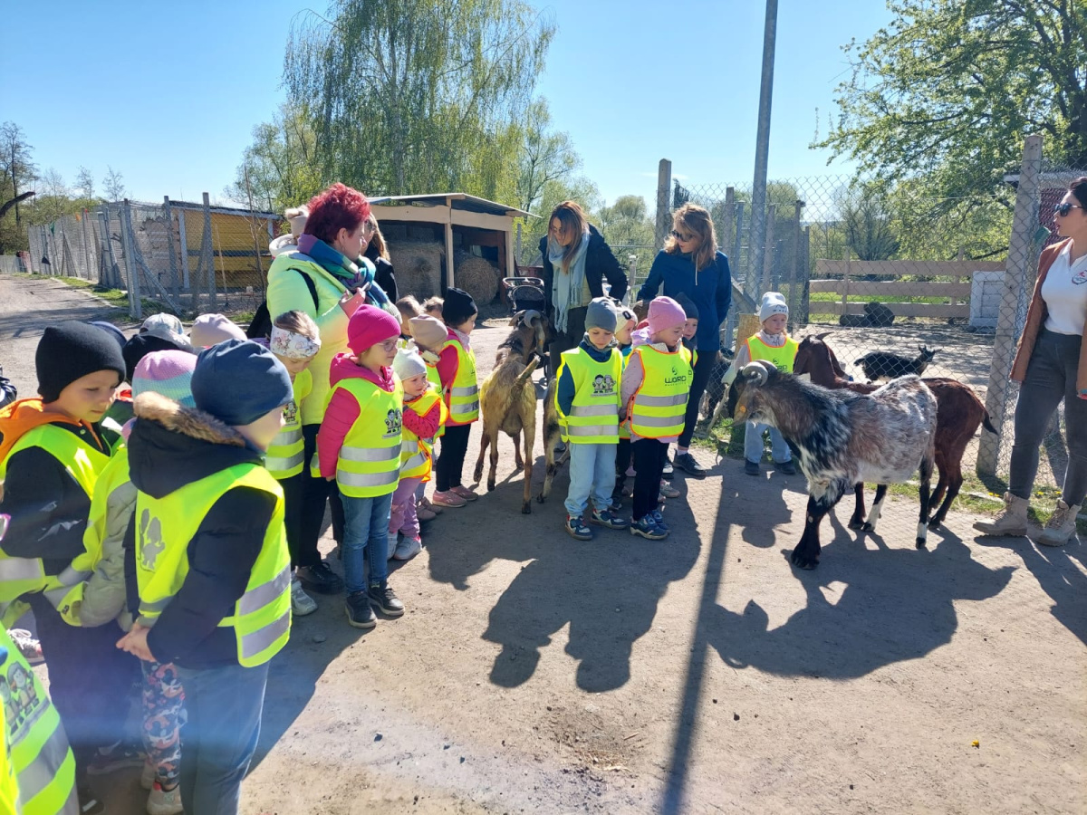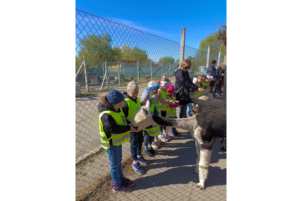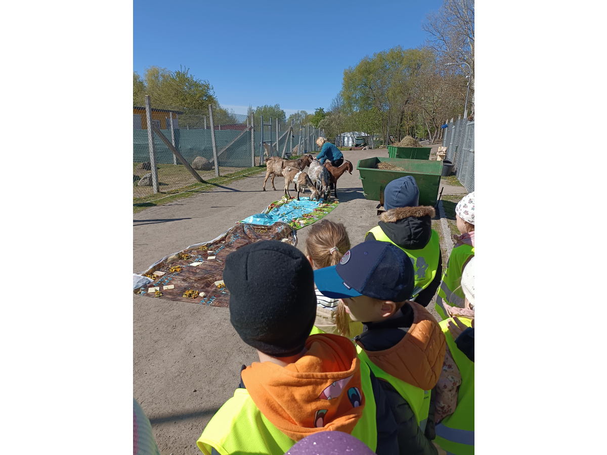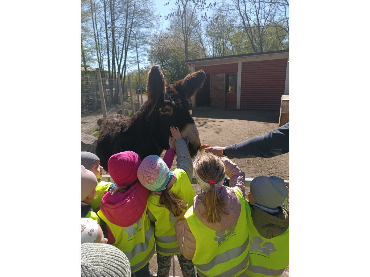 Odwiedziliśmy Krainę Dolnej Wisły - bardzo piękne miejsce, pełne zwierząt i cudnej przyrody! Wszystkim nam się bardzo podobało, a miejsce było przepiękne, szczególnie wiosną - kiedy wszystko kwitnie, w zagrodach są małe, dopiero co urodzone zwierzątka! Podczas pobytu mieliśmy okazję poznać wiele różnych zwierząt takich jak: alpaki, owce walliserskie, osły Poitou, kozy anglonubijskie. Widzieliśmy też białego kangura Walabia-Bennetta. Pierwszy raz zobaczylismy zwierzę o nazwie mara patagońska. Oprócz tego widzieliśmy kozy, papugi, kury i koguty, pawie oraz emu. Największą atrakcją były alpaki, które chętnie jadły nam z ręki, co sprawiło nam dużo radości. Dla kóz przygotowaliśmy „szwedzki stół”, dzięki czemu mogliśmy je obserwować z bliska i zobaczyć ich zwyczaje oraz poznać ich ulubione menu. Na własnej skórze przekonaliśmy się również, co oznacza powiedzenie „uparty jak osioł”. Cała wycieczka była nie tylko świetną zabawą, ale też wartościową lekcją o zwierzętach i przyrodzie! Malowaliśmy też gipsowe figurki zwierząt, a na koniec mieliśmy piknik w altance oraz zabawy na dmuchańcach. Było suuuuuper!